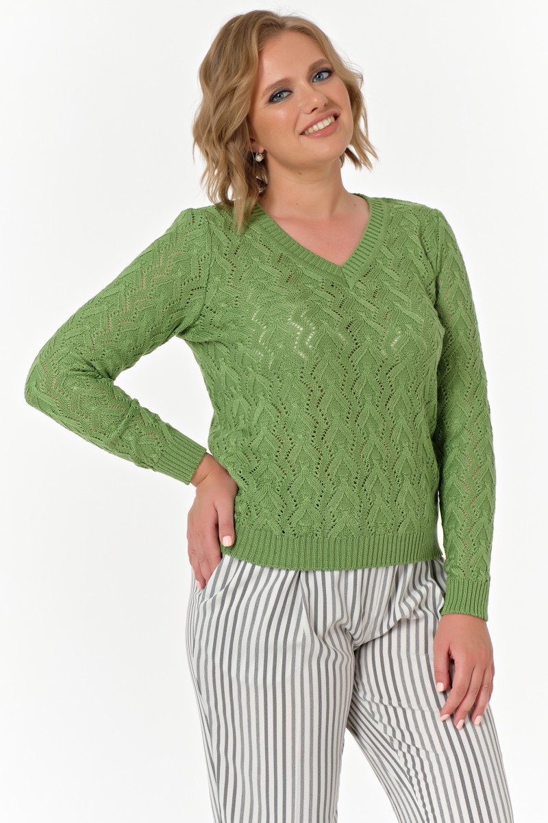 Джемпер с V-вырезом ажурной вязки зеленый