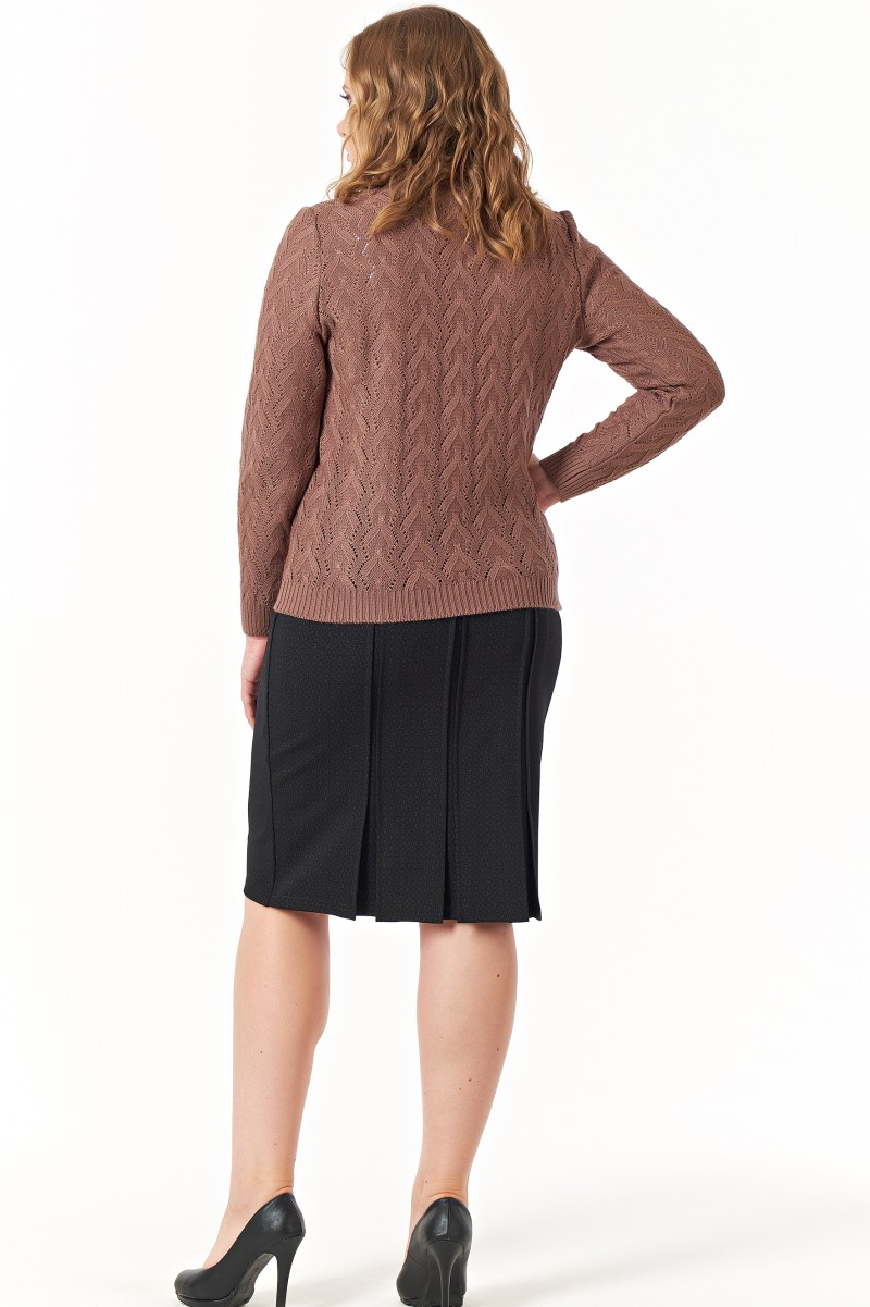 Ажурная вязка с узором-домиками создает игру света и тени на ткани. V-образный вырез мягко подчеркивает линию декольте а прямой силуэт обеспечивает комфорт на весь день.