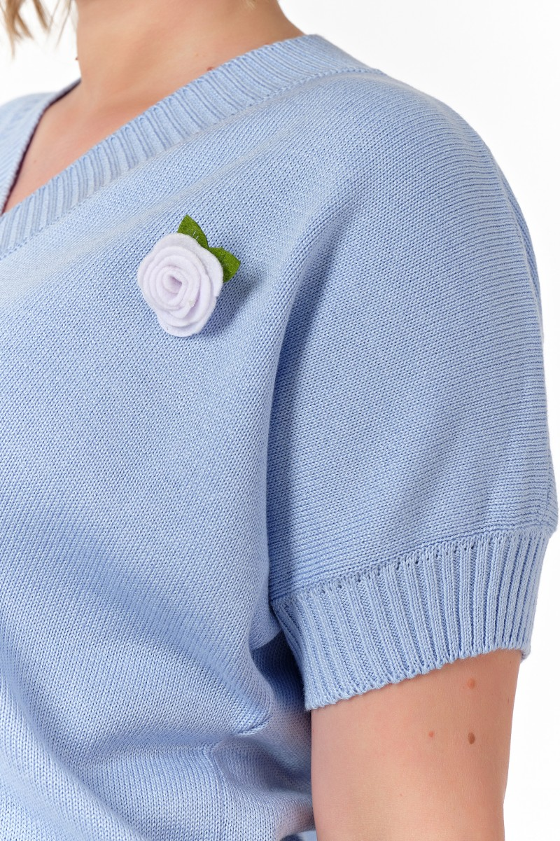 Этот голубой джемпер доказывает что базовые вещи могут быть стильными. V-образный вырез красиво обрамляет шею и создает изящную линию декольте а короткие рукава добавляют легкости образу. Прямой силуэт не сковывает движения и подходит разным типам фигуры.Вязаное полотно приятно к телу и дышит что особенно важно в теплое время года. Джемпер легко сочетается с классическими брюками прямого кроя для офисного стиля или с зауженными для более современного лука. Средняя посадка брюк создаст гармоничный образ для деловой встречи.Для прогулки можно выбрать свободные брюки-бананы с поясом на резинке – получится комфортный casual-образ. А для вечеринки джемпер отлично дополнят зауженные брюки с высокой посадкой которые подчеркнут талию и визуально удлинят ноги. Универсальный голубой оттенок освежает лицо и гармонично вписывается в любую цветовую гамму гардероба.