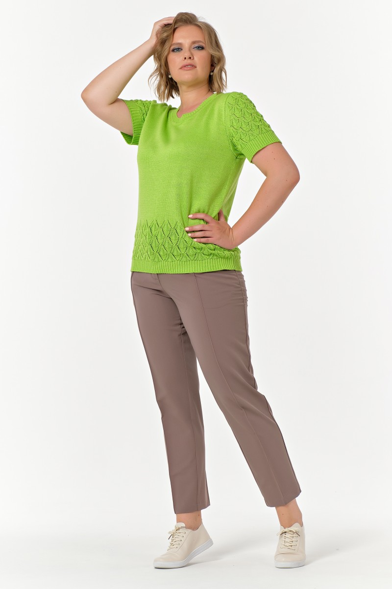 Этот джемпер словно впитал в себя энергию весеннего сада. Насыщенный зеленый цвет мгновенно привлекает внимание и становится ярким акцентом в образе. Прямой силуэт универсален и подходит разным типам фигуры создавая элегантную линию без лишних объемов.Особое очарование модели – в деталях. Ажурные вставки на коротких рукавах и по низу джемпера создают игру света и тени добавляя текстуре изысканности. Круглая горловина подчеркивает линию шеи а аккуратная отделка по краю завершает общий образ.Мягкий трикотаж приятен к телу и не стесняет движений. Материал дышит и сохраняет форму после стирки. Такой джемпер легко сочетается с классическими брюками прямого силуэта для офиса или с джинсами для прогулки по городу.Модель подходит для деловых встреч когда нужно выглядеть профессионально но не скучно. В паре с юбкой-карандаш создает стильный образ для вечеринки. А с брюками-палаццо превращается в комфортный наряд для путешествий.