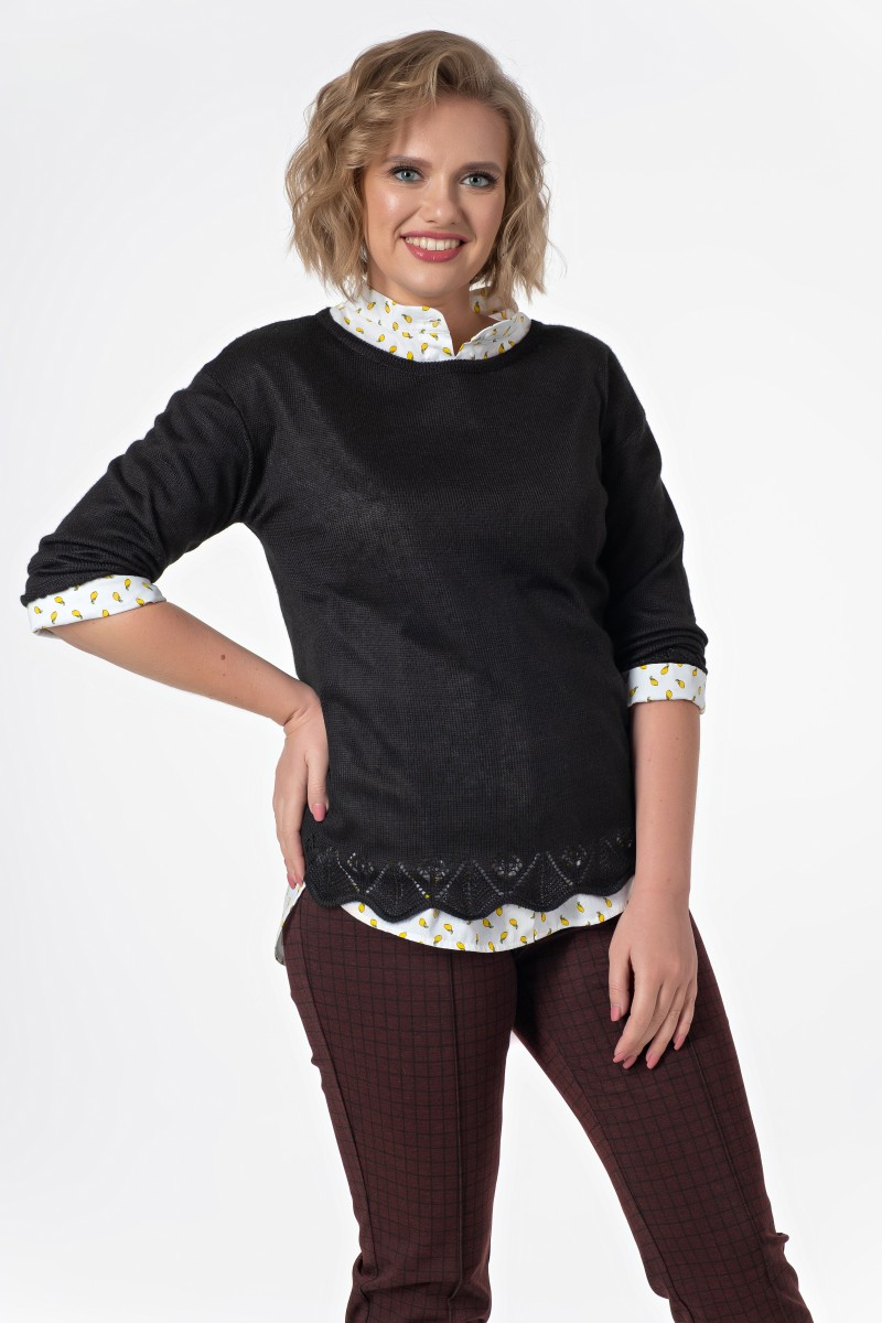 Черный джемпер прямого силуэта с изящными ажурными деталями по краям создает ощущение легкой элегантности. Мягкий трикотаж окутывает силуэт не сковывая движений а круглый вырез подчеркивает линию шеи.