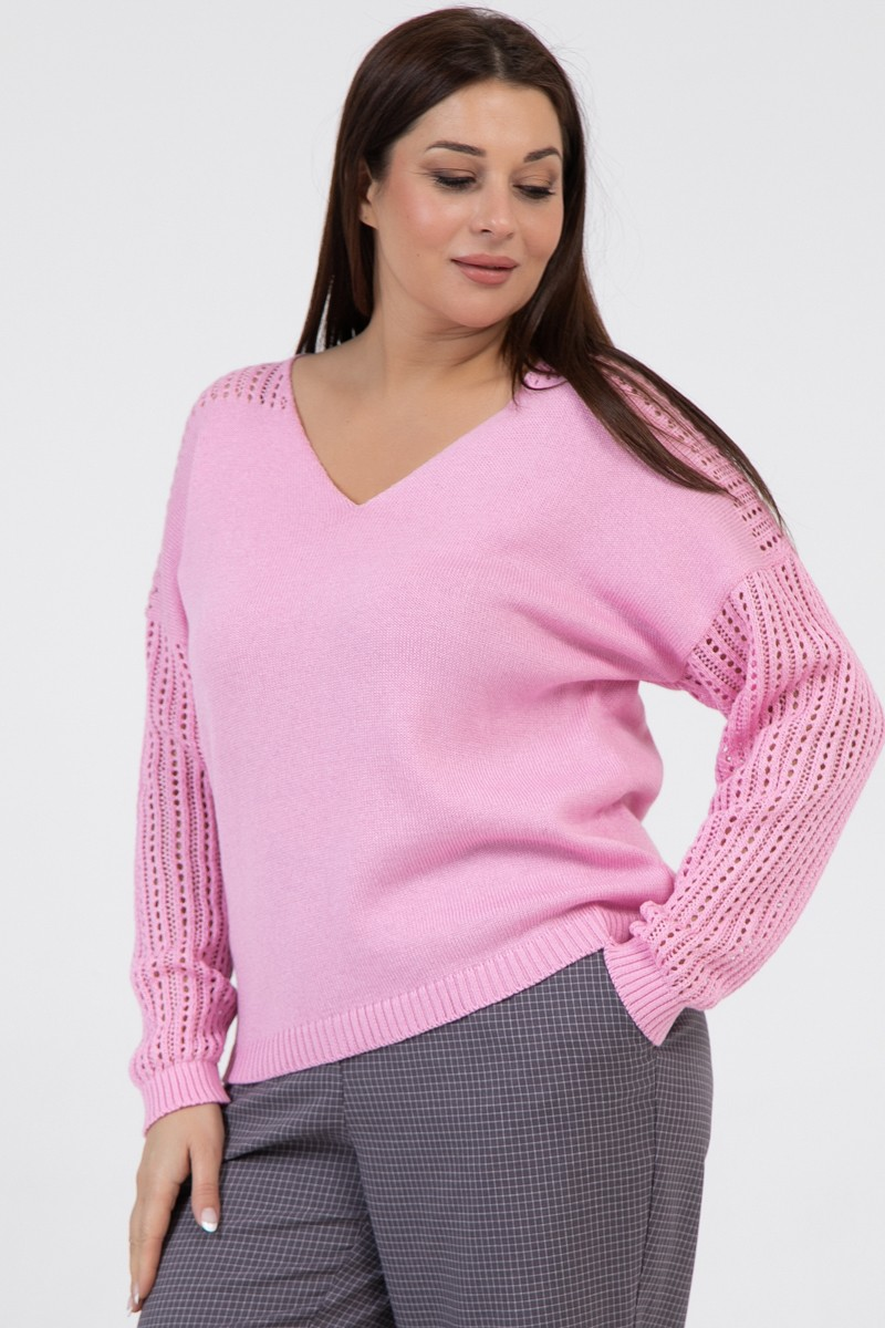 Романтика в каждой детали — так можно описать этот изящный джемпер нежно-розового оттенка. V-образный вырез создает элегантную линию декольте визуально удлиняя шею и подчеркивая женственность. Особый шарм модели придают ажурные узоры которые начинаются на плечах и плавно переходят на рукава полной длины.Натуральный хлопок делает джемпер не только красивым но и практичным — он дышит сохраняет форму и приятен к телу. Свободный крой не сковывает движений позволяя чувствовать себя комфортно в любой ситуации.Этот джемпер станет основой для создания множества образов. С юбкой-карандаш он превратится в элегантный деловой образ для офиса. В паре с широкими брюками создаст непринужденный casual-лук для прогулки или дружеской встречи. А с изящной юбкой миди подойдет для романтического свидания или особого случая.Нежный розовый цвет освежает лицо и добавляет образу мягкости. Ажурные детали играют светом создавая интересные визуальные эффекты. Завершённый образ получается без лишних усилий — достаточно добави