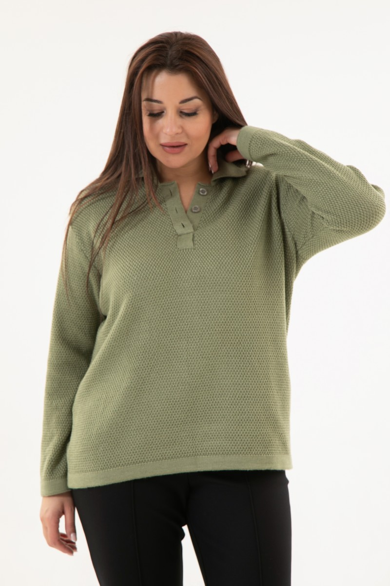 Этот джемпер в оттенке зеленого чая станет основой для множества образов. Воротник поло с застежкой на пуговицы позволяет играть с декольте – можно носить застегнутым до верха для строгого офисного лука или расстегнуть пару пуговиц для более расслабленного настроения. Длинные рукава и свободный крой создают комфорт в движении а мягкий трикотаж приятно прилегает к теле. Фактурный узор добавляет глубины однотонному цвету и делает джемпер самодостаточным элементом гардероба.В офисе он отлично сочетается с прямыми деловыми брюками и классическими туфлями. На выходных можно создать casual образ с зауженными джинсами и кроссовками. Для вечерней прогулки подойдут брюки-бананы свободного кроя.Натуральные волокна в составе обеспечивают воздухопроницаемость и долговечность изделия. Это тот случай когда простота формы компенсируется качеством исполнения и универсальностью применения. Джемпер одинаково уместен на деловой встрече и в путешествии.