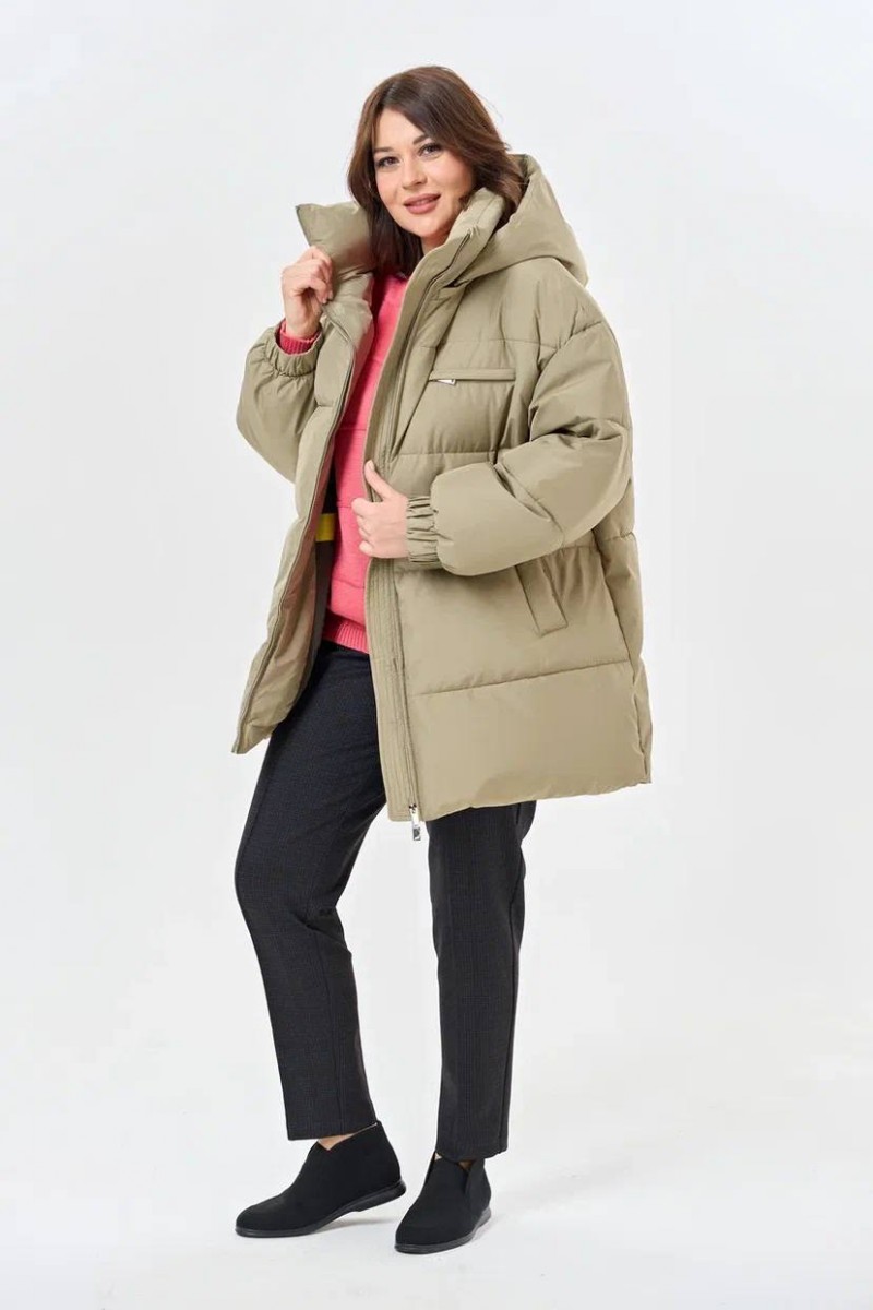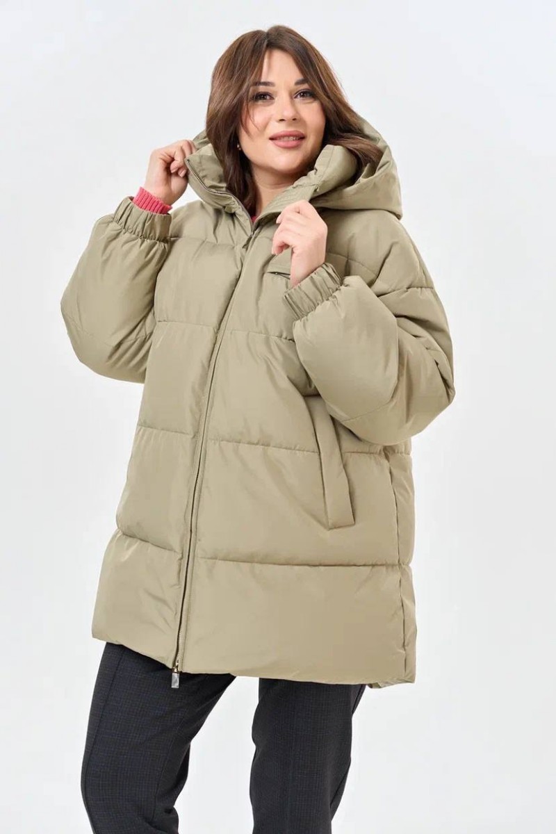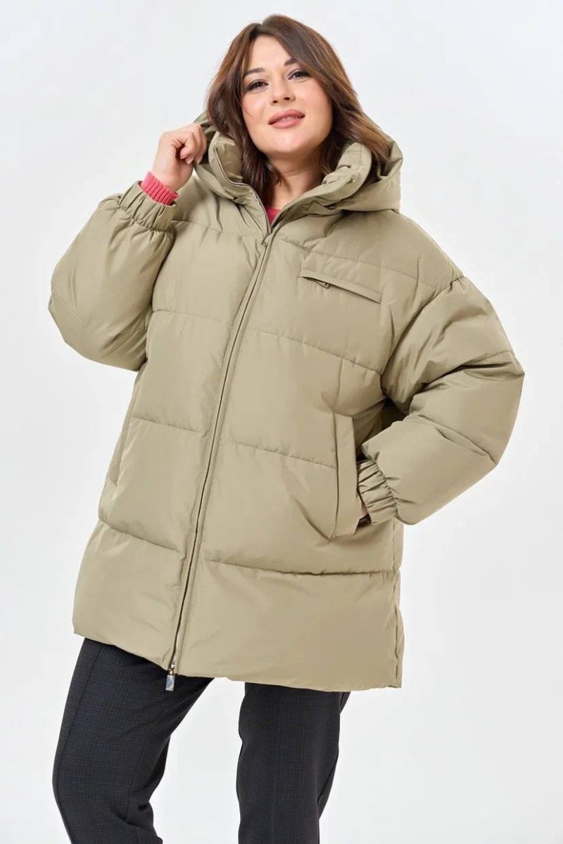 Женский пуховик прямого силуэта с отстегивающимся капюшоном цвета хаки.