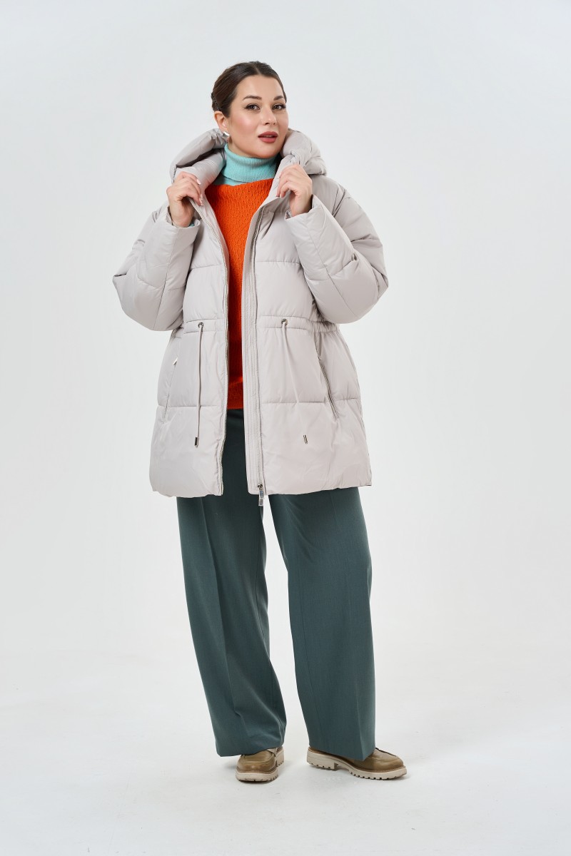 Женская куртка с воротником-стойкой и интересным капюшоном. Оснонвая застежка на молнии. На полочках расположены вертикальные прорезные карманы на молнии. По спинке добавлена кулиска. В рукавах – трикотажные манжеты.