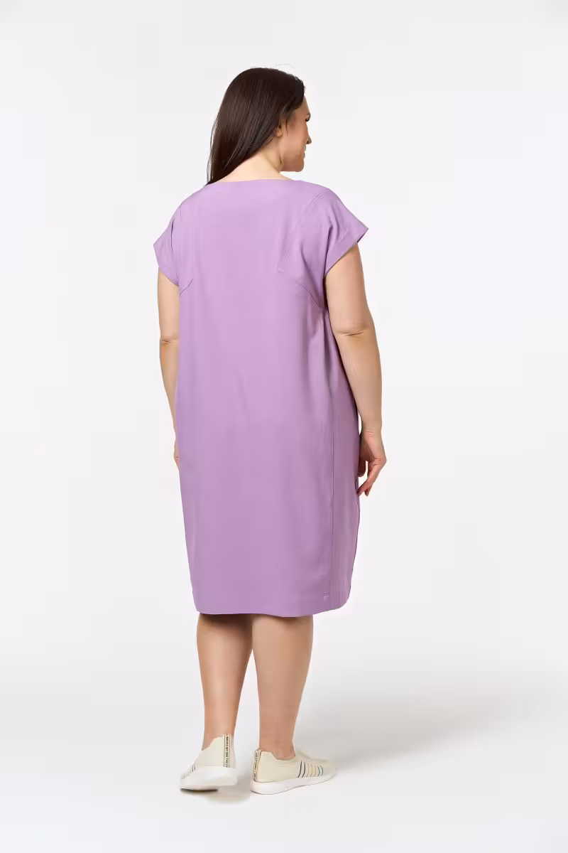 Сиреневый оттенок этого платья напоминает о летних закатах и создает романтичное настроение. Прямой силуэт работает как волшебная палочка – скрывает недостатки и подчеркивает достоинства любой фигуры. Длина ниже колена остается актуальной в любом сезоне и подходит для разных поводов.Спущенные рукава добавляют современности классическому крою и создают непринужденный шик. Овальная горловина мягко обрамляет зону декольте не стесняя движений. Декоративные вставки на спине и переде создают интересную игру линий и добавляют структурности силуэту.Вертикальные швы не просто украшают модель – они визуально вытягивают фигуру и создают стройнящий эффект. В этих же швах спрятаны удобные карманы для мелочей. Натуральная ткань приятна к телу и не сковывает движения в течение дня.Платье одинаково органично смотрится в офисе с жакетом и на вечеринке с изящными украшениями. Подходит для деловых встреч прогулок по городу и путешествий.