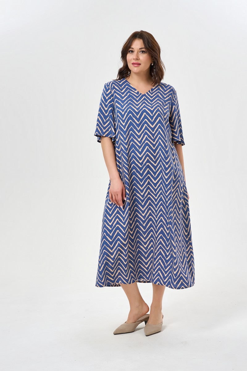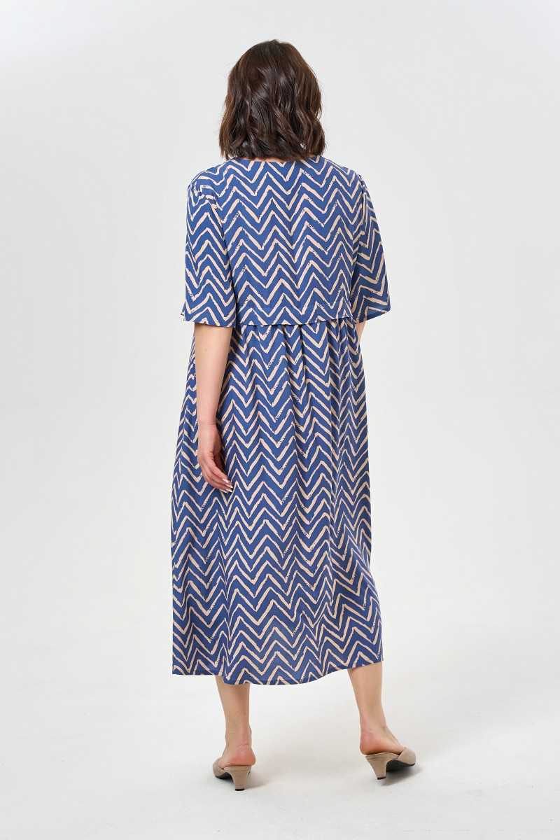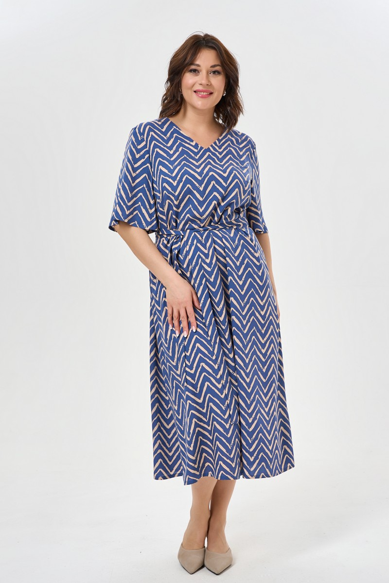 Синее платье с графичным зигзагообразным принтом станет основой для множества образов. Свободный силуэт не сковывает движения позволяя чувствовать себя комфортно с утра до вечера. Пояс создаёт красивую линию талии подчёркивая женственные изгибы. V-образный вырез визуально стройнит и удлиняет шею. Короткие расклешённые рукава добавляют игривости образу и скрывают несовершенства рук. Особая деталь на спинке с мягкими складками создаёт интересную фактуру и объём. Длина до середины икры универсальна для любого типа фигуры. Качественная ткань с добавлением натуральных волокон обеспечивает воздухопроницаемость и приятные тактильные ощущения. Такое платье уместно на деловой встрече с пиджаком на прогулке с кедами на вечеринке с босоножками на каблуке. Геометричный принт добавляет современности классическому крою. Это выбор для женщин которые ценят стиль и комфорт одновременно.