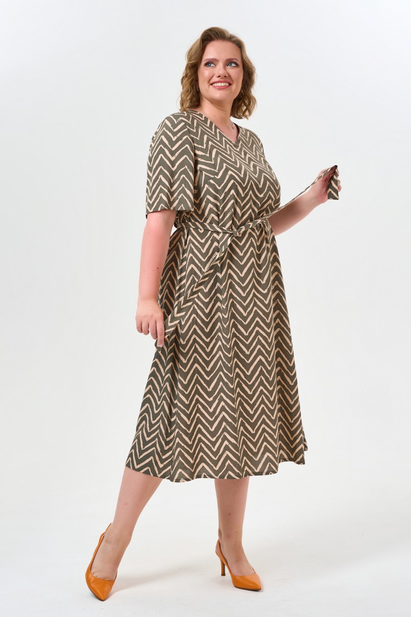 Это платье воплощает философию современной женственности – когда красота не требует жертв. Свободный силуэт дарит ощущение легкости словно второя кожа которая дышит вместе с вами. V-образный вырез создает элегантную линию визуально удлиняя шею и подчеркивая естественную грацию. Особая изюминка модели – мягкие складки на спине которые формируют объем и добавляют движения даже в статичных позах.Короткие рукава с легким расклешением от плеча напоминают крылья бабочки – они создают красивую линию рук и скрывают возможные несовершенства. Пояс позволяет варьировать посадку: завязать туже для подчеркнутой талии или свободнее для расслабленного образа. Качественная ткань с геометричным принтом держит форму и не сковывает движения.Платье станет спутником утренних встреч в кафе рабочих дней в креативном офисе или вечерних прогулок по городу. Дополните образ босоножками на каблуке для элегантности или кедами для casual-настроения. Это та самая вещь в которой чувствуешь себя собой – красивой уверенной и комфор