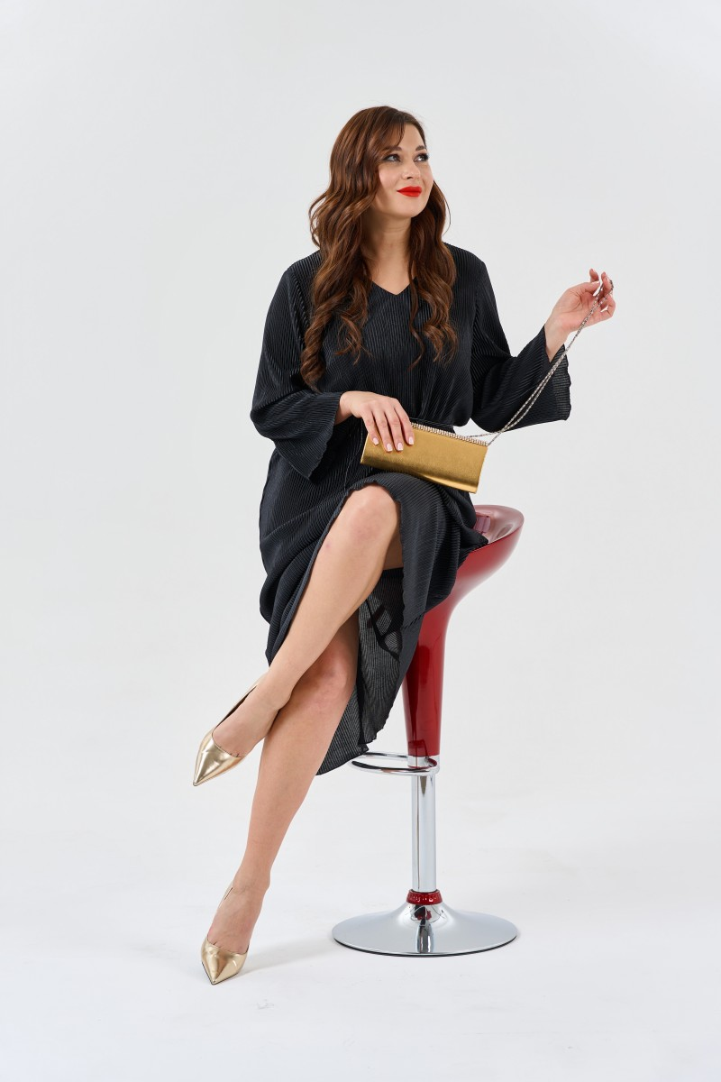 Черное платье миди свободного стиля становится основой для самых разных образов благодаря продуманному свободному силуэту. Удлиненная модель с рукавами до запястья создает элегантный силуэт который подходит для праздничных событий и особых случаев. V-образный вырез визуально удлиняет шею и подчеркивает декольте а свободная посадка обеспечивает комфорт в движении.Изюминка модели – тонкий плетеный кожаный пояс который позволяет регулировать силуэт по настроению. Можно носить платье совсем свободно для расслабленного образа или подчеркнуть талию поясом для более структурированного look’а. Универсальный оверсайз крой подходит разным типам фигуры.Плотная ткань не просвечивает и красиво держит форму создавая безупречный силуэт. Платье отлично сочетается с золотистыми туфлями для вечернего выхода ботильонами для городских прогулок или кроссовками для casual образа. Длина миди универсальна – подходит для офиса свидания семейного праздника или дружеской встречи. Это та самая вещь которая решает вопрос “”что надеть”” одним дв