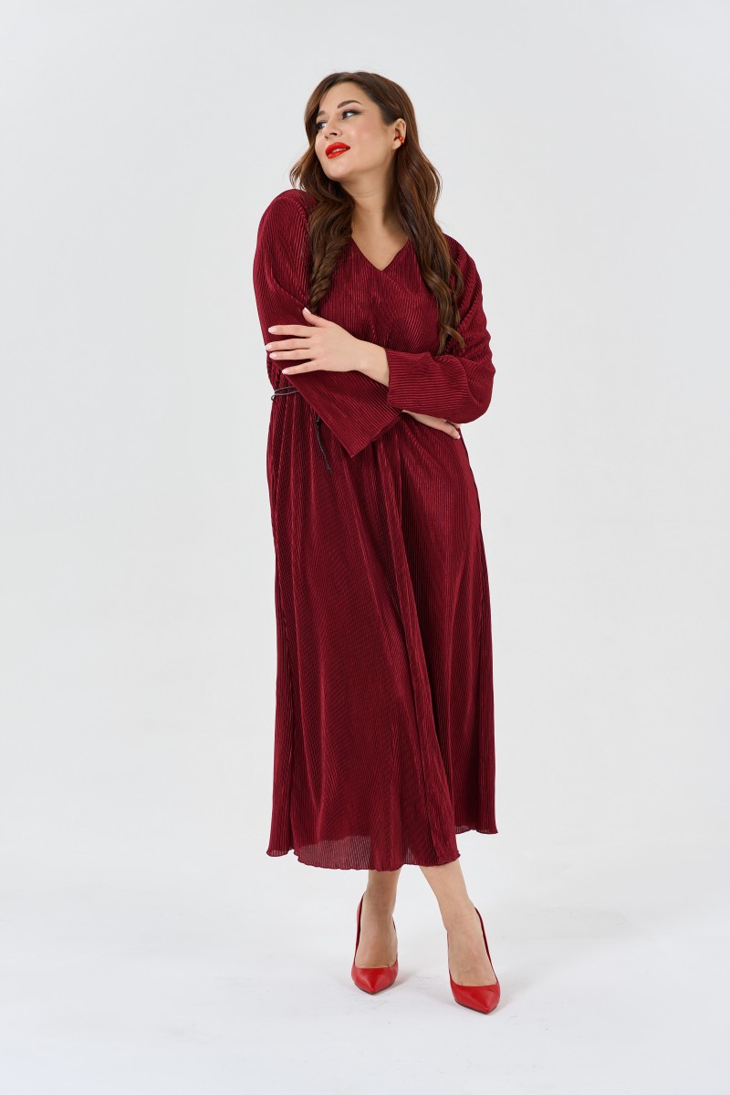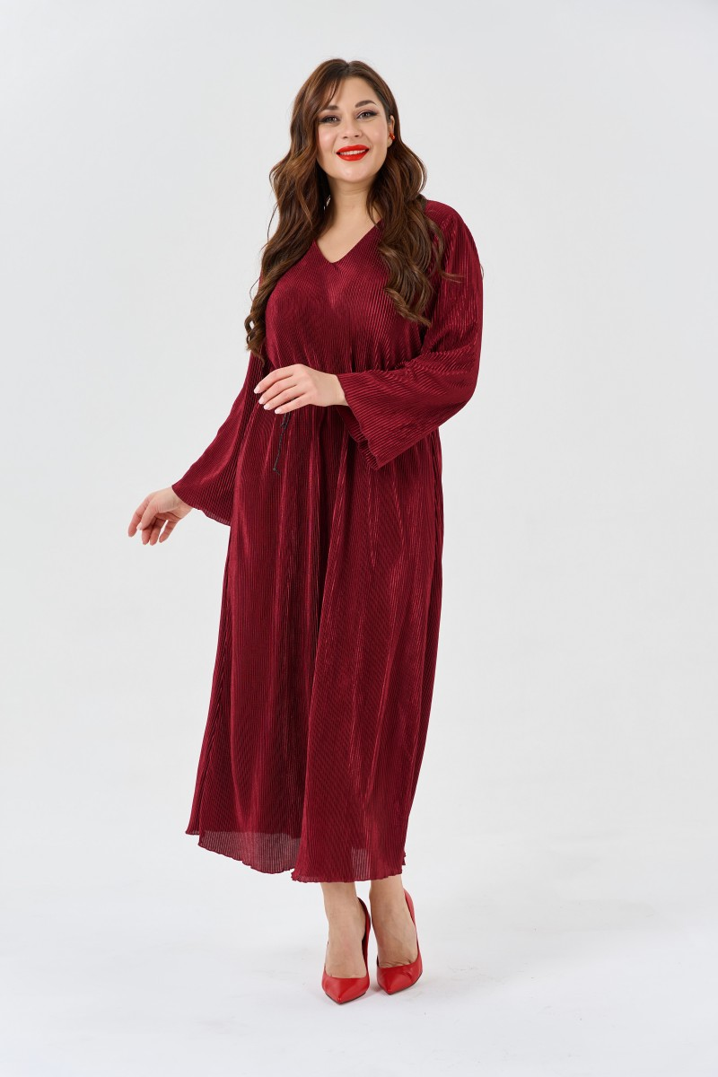 Это платье в насыщенном бордовом цвете станет основой для создания запоминающихся образов. Свободный крой не сковывает движения и позволяет чувствовать себя комфортно весь день. Длинные рукава с мягкими манжетами на запястьях добавляют элегантности а V-образный вырез создает красивую линию декольте.Макси-длина визуально вытягивает силуэт и придает образу торжественность. Платье прекрасно подходит для праздничных мероприятий романтических ужинов или важных встреч. Тонкий плетеный пояс из кожи подчеркивает талию и добавляет акцент в образ.Ткань хорошо держит форму и не просвечивает что обеспечивает комфорт при носке. Модель представлена в двух размерных группах что позволяет выбрать идеальную посадку. Сочетается с элегантными туфлями на каблуке для вечернего выхода или с ботильонами для повседневного образа.Глубокий бордовый оттенок универсален и подходит для любого времени года. Платье легко комбинируется с аксессуарами и верхней одеждой.