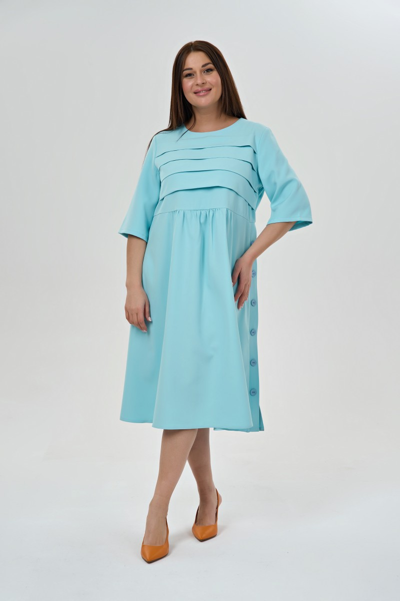 Это голубое платье словно создано для особенных моментов жизни. Романтичные складки на груди придают образу нежность и объем а силуэт трапеция деликатно скрывает особенности фигуры. Круглая горловина открывает изящную линию шеи создавая женственный акцент.Декоративные пуговицы на боку добавляют платью игривости и стиля. Рукава до локтя создают элегантный баланс между закрытостью и открытостью образа. Длина миди универсальна – подходит как для дневных мероприятий так и для вечерних встреч.Приятная на ощупь ткань обеспечивает комфорт в течение всего дня. Это платье станет прекрасным выбором для праздничного ужина дня рождения или романтического свидания. Дополните образ изящными туфлями и минимумом украшений – платье само по себе является украшением гардероба.Нежный голубой оттенок освежает цвет лица и создает весеннее настроение независимо от сезона.