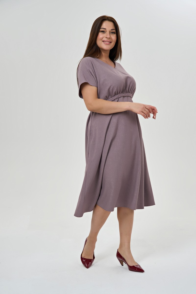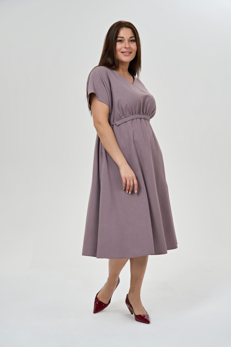 Лиловое платье с завышенной линией груди и свободной юбкой создает романтичный образ в стиле современной богемы. Пояс позволяет регулировать силуэт под настроение и фигуру. Короткие широкие рукава добавляют непринужденности и комфорта движениям.