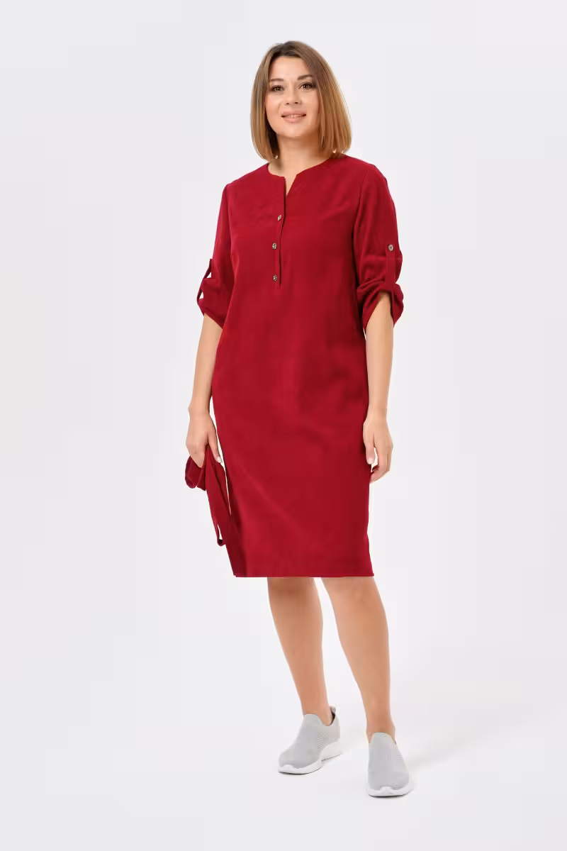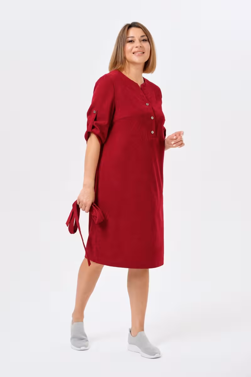 Насыщенный бордовый оттенок этого платья напоминает о глубине осенних красок и благородстве классических тонов. Прямой силуэт создает безупречную линию которая одинаково эффектно смотрится на разных типах фигур. Завязывающийся пояс дает свободу выбора – можно подчеркнуть талию для более женственного образа или оставить платье свободным для комфортного повседневного лука.Рукава три четверти с декоративными завязками добавляют интересную деталь и позволяют регулировать длину в зависимости от настроения и погоды. Круглая горловина с аккуратной отделкой завершает лаконичный дизайн.Это платье станет основой для деловых встреч в сочетании с жакетом и классическими туфлями. Для прогулок достаточно дополнить образ кроссовками или ботинками. Вечерний выход требует лишь смены аксессуаров – изящных украшений и каблуков.Качественная ткань держит форму и обеспечивает комфорт в течение всего дня. Длина до колена делает модель универсальной для разных поводов – от офисных будней до неформальных встреч с друзьями.