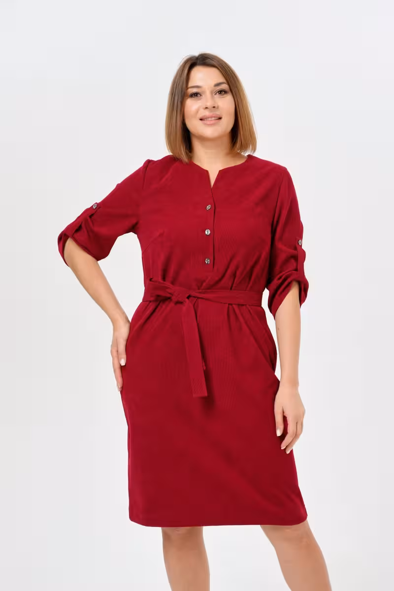 Платье прямого силуэта с поясом бордовое