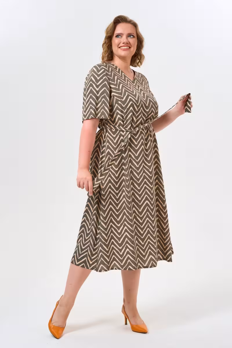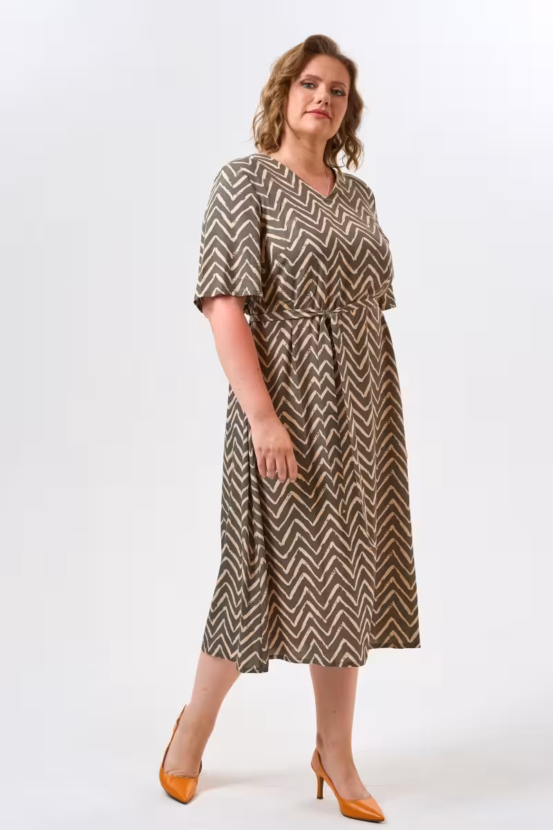 Это платье воплощает философию современной женственности – когда красота не требует жертв. Свободный силуэт дарит ощущение легкости словно второя кожа которая дышит вместе с вами. V-образный вырез создает элегантную линию визуально удлиняя шею и подчеркивая естественную грацию. Особая изюминка модели – мягкие складки на спине которые формируют объем и добавляют движения даже в статичных позах.Короткие рукава с легким расклешением от плеча напоминают крылья бабочки – они создают красивую линию рук и скрывают возможные несовершенства. Пояс позволяет варьировать посадку: завязать туже для подчеркнутой талии или свободнее для расслабленного образа. Качественная ткань с геометричным принтом держит форму и не сковывает движения.Платье станет спутником утренних встреч в кафе рабочих дней в креативном офисе или вечерних прогулок по городу. Дополните образ босоножками на каблуке для элегантности или кедами для casual-настроения. Это та самая вещь в которой чувствуешь себя собой – красивой уверенной и комфор