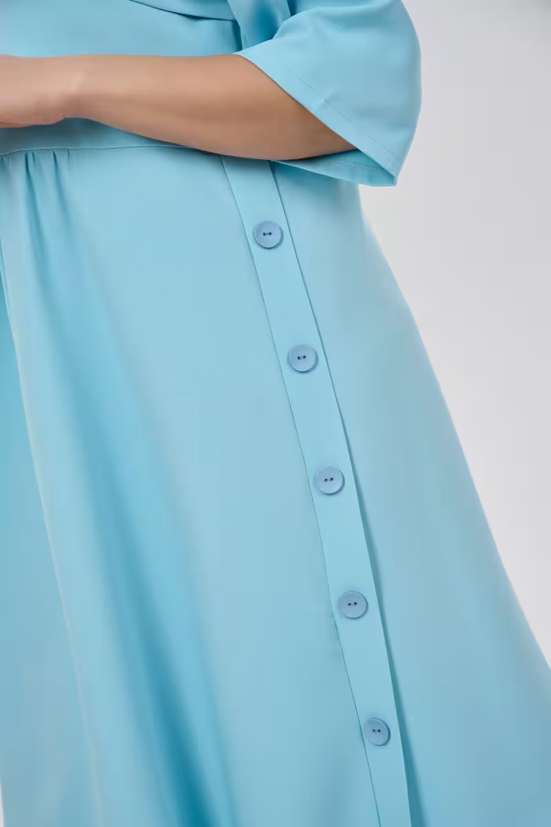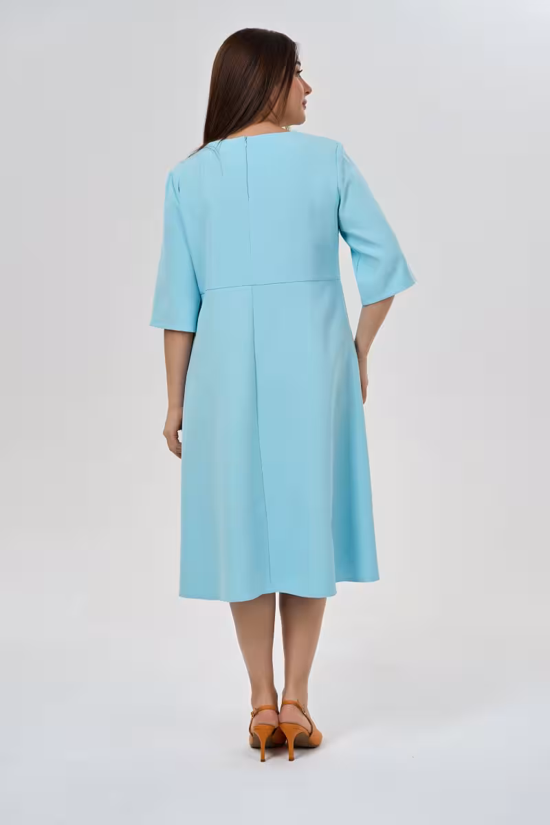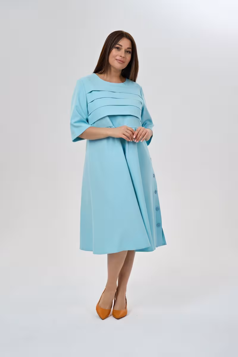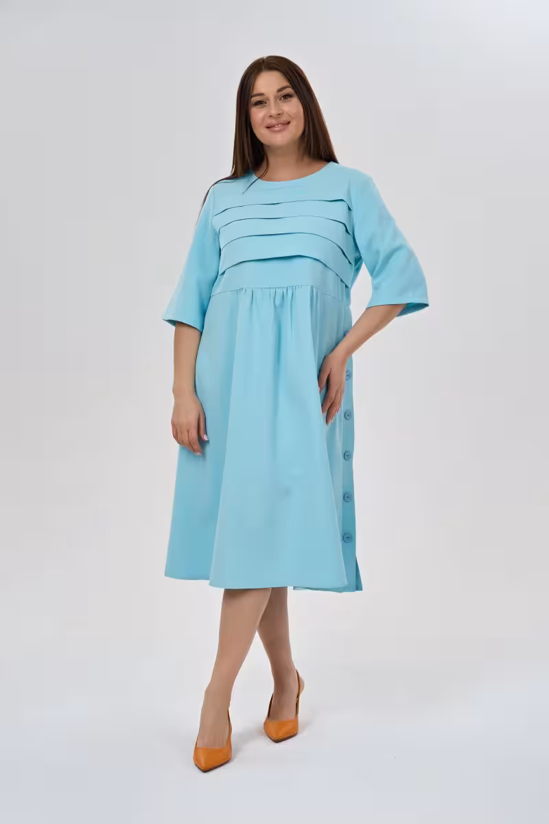 Это голубое платье словно создано для особенных моментов жизни. Романтичные складки на груди придают образу нежность и объем а силуэт трапеция деликатно скрывает особенности фигуры. Круглая горловина открывает изящную линию шеи создавая женственный акцент.Декоративные пуговицы на боку добавляют платью игривости и стиля. Рукава до локтя создают элегантный баланс между закрытостью и открытостью образа. Длина миди универсальна – подходит как для дневных мероприятий так и для вечерних встреч.Приятная на ощупь ткань обеспечивает комфорт в течение всего дня. Это платье станет прекрасным выбором для праздничного ужина дня рождения или романтического свидания. Дополните образ изящными туфлями и минимумом украшений – платье само по себе является украшением гардероба.Нежный голубой оттенок освежает цвет лица и создает весеннее настроение независимо от сезона.
