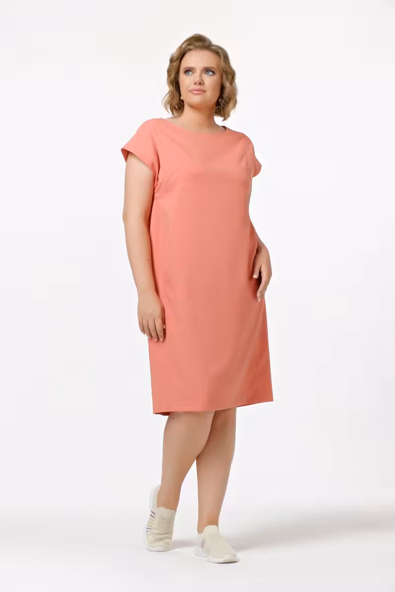 Коралловое платье прямого силуэта длиной миди становится основой для множества образов. Овальный вырез горловины мягко обрамляет декольте а спущенные рукава создают расслабленную элегантность. Вертикальные линии от верхней части платья зрительно вытягивают фигуру и добавляют структурности простому крою.Скрытые карманы решают вечную женскую проблему – куда положить телефон и мелочи не нарушая силуэт. Длина ниже колена универсальна для разных типов фигур и подходит как для офисных встреч так и для неформальных мероприятий.Натуральная ткань обеспечивает комфорт в течение всего дня не сковывает движений и приятна к телу. В паре с жакетом и лодочками получается деловой образ с кроссовками и джинсовой курткой – casual для выходных. Коралловый цвет освежает лицо и сочетается с нейтральными оттенками гардероба. Это платье для женщин ценящих комфорт без компромиссов в стиле.