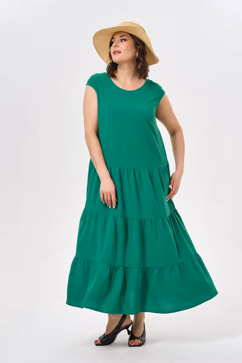 Это платье в насыщенном изумрудном цвете станет спасением в жаркие летние дни. Свободный крой позволяет коже дышать а три волнообразных яруса добавляют образу романтики и движения. Круглый вырез горловины смягчает линии лица а широкие рукава в стиле кимоно скрывают несовершенства рук и создают расслабленную атмосферу.Такое платье универсально для разных случаев. На прогулку по парку его дополнят белые кроссовки и соломенная шляпа. Для вечеринки на террасе подойдут босоножки на танкетке и изящные украшения. В путешествие оно займет минимум места в чемодане но обеспечит максимум комфорта.Натуральная ткань приятна к телу и не сковывает движений. Длина макси визуально вытягивает силуэт а ярусная конструкция скрывает особенности фигуры. Это платье для тех кто ценит комфорт без ущерба стилю и предпочитает естественную красоту вычурным деталям. Зеленый цвет освежает лицо и подходит практически всем типам внешности.