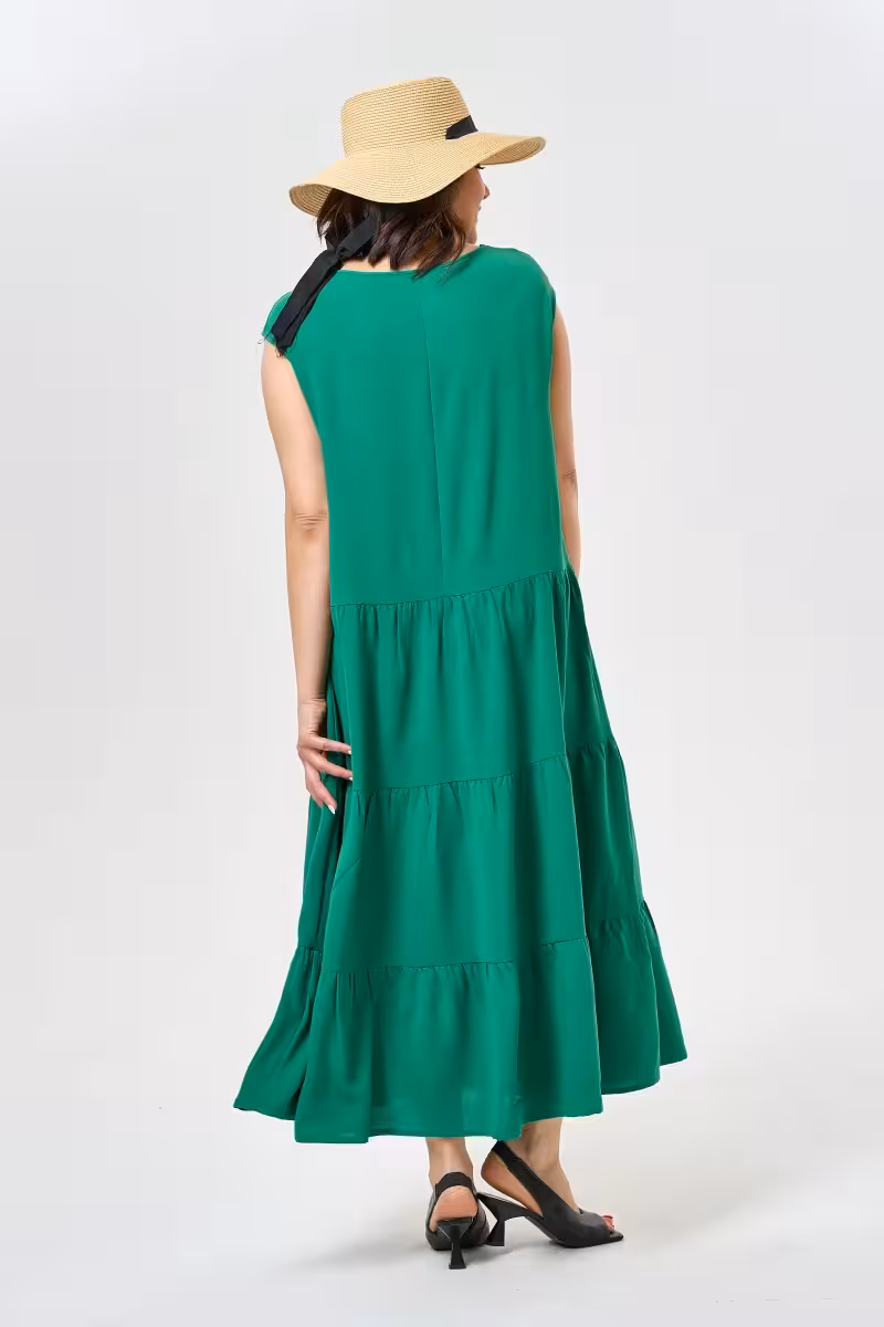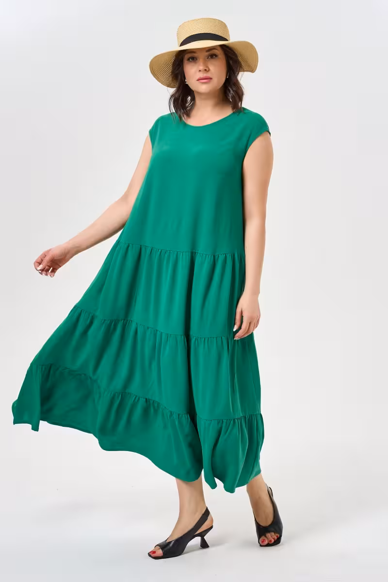 Воздушное платье в сочном зеленом оттенке дарит ощущение легкости и свободы движений. Три романтичных яруса создают игривый силуэт который подчеркивает женственность без лишних акцентов.