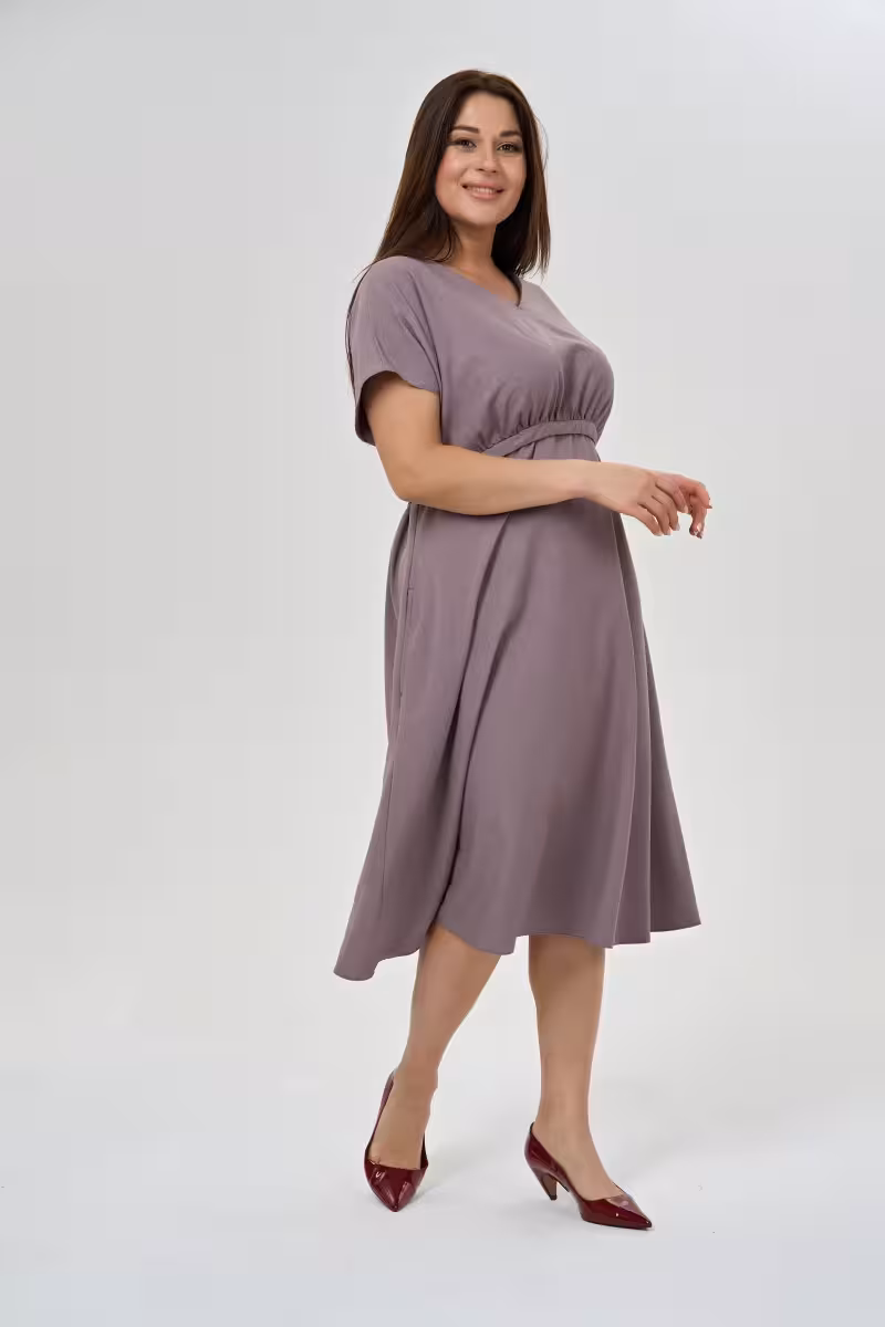 Лиловое платье миди с завышенной линией под грудью и расклешенной юбкой воплощает баланс комфорта и женственности. Широкие короткие рукава в стиле кимоно дают свободу движений и создают расслабленную элегантность. Особенность модели – регулируемый пояс который позволяет варьировать силуэт от свободного бохо до подчеркнуто женственного. Завышенная линия груди визуально удлиняет ноги и создает изящные пропорции. Мягкая ткань приятно облегает фигуру не сковывая движений. Универсальная длина миди делает платье подходящим для офиса с жакетом и для прогулок с сандалиями. Лиловый оттенок освежает образ и гармонично сочетается как с нюдовой обувью для дневного лука так и с яркими аксессуарами для вечернего выхода. Платье станет основой для создания образов на каждый день – от деловых встреч до романтических свиданий.