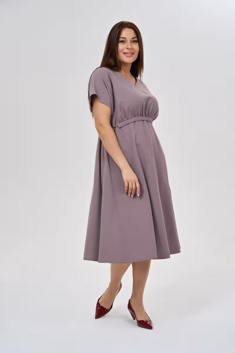 Лиловое платье с завышенной линией груди и свободной юбкой создает романтичный образ в стиле современной богемы. Пояс позволяет регулировать силуэт под настроение и фигуру. Короткие широкие рукава добавляют непринужденности и комфорта движениям.