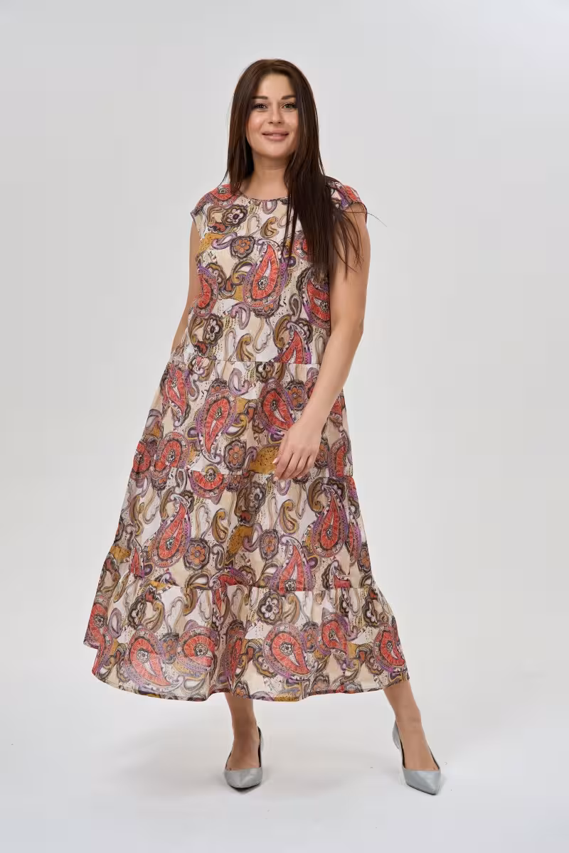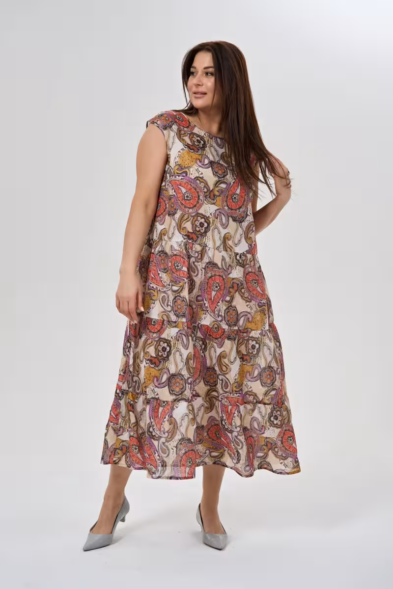 Это летнее платье словно создано для тех кто ценит комфорт без ущерба для стиля. Свободный силуэт не сковывает движений позволяя чувствовать себя естественно в любой ситуации. Трёхъярусная юбка на мягких сборках создаёт красивый объём и придаёт образу романтичность.Широкие рукава в стиле кимоно добавляют платью особую изящность и отлично скрывают недостатки фигуры в области плеч. Круглая горловина универсальна и подходит любому типу лица. Деликатная отделка горловины и пройм рукавов завершает продуманный дизайн.Лёгкая ткань приятно струится по фигуре создавая эффектные переливы при движении. Платье идеально для прогулок по городу встреч с друзьями или романтических свиданий. В офисе оно будет уместно с жакетом а для вечеринки достаточно добавить яркие аксессуары.Универсальная длина позволяет носить платье с балетками для повседневных образов или с каблуками для более торжественных случаев. Это та самая вещь которая помогает выглядеть стильно без особых усилий.