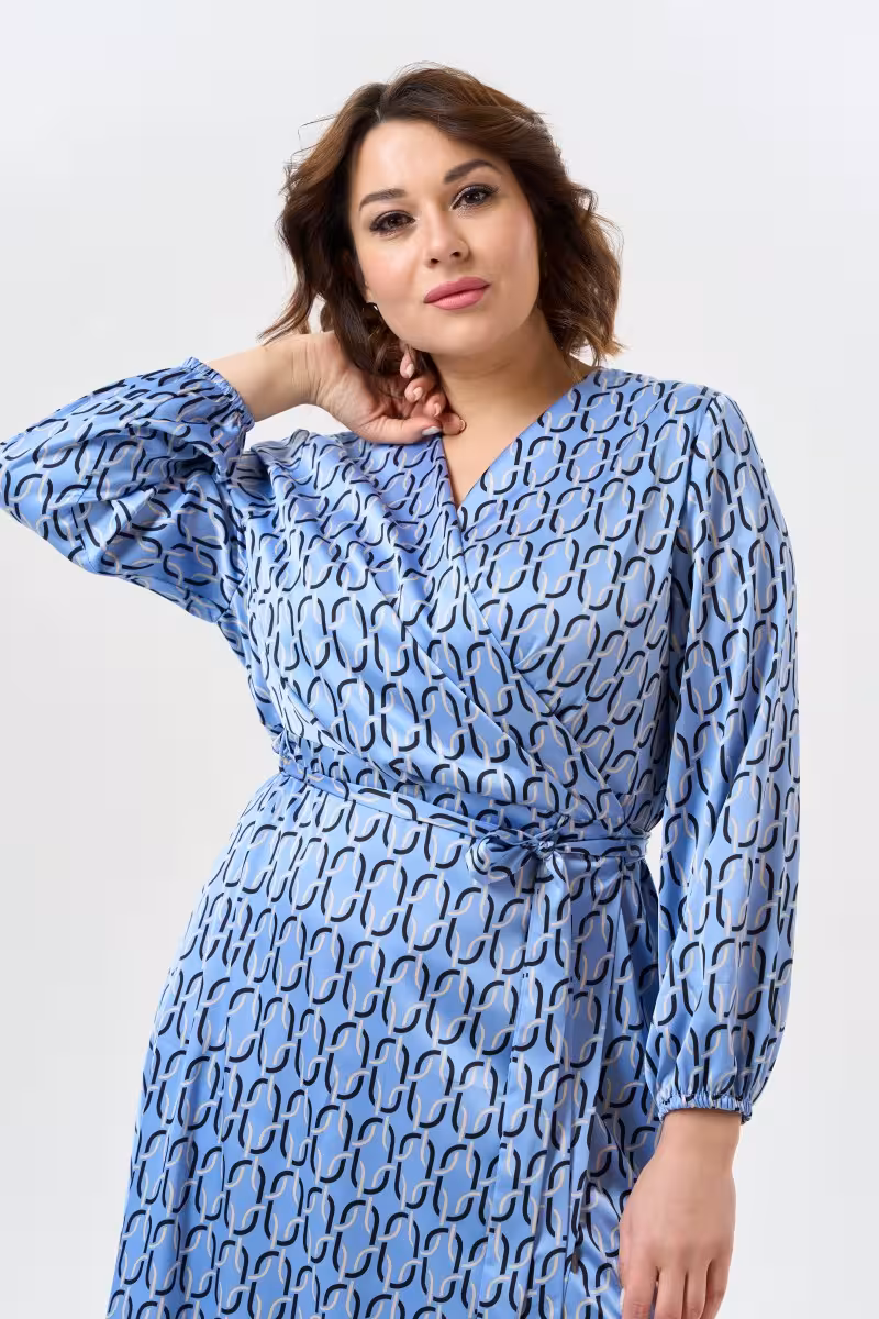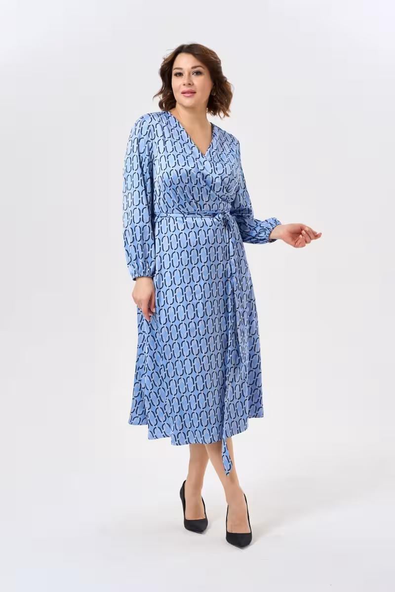 Это платье воплощает классику женственности в современной интерпретации. Силуэт на запах создает идеальные пропорции визуально подчеркивая талию и скрывая особенности фигуры. Пояс завязывающийся чуть выше естественной линии талии позволяет регулировать посадку под настроение дня.Расклешенная юбка струится при ходьбе создавая эффект легкости и грации. Длинные рукава собраны внизу на мягкую резинку что добавляет романтичности образу и защищает от прохладного ветра. V-образный вырез удлиняет шею и открывает зону декольте в элегантной манере.Синий принт делает платье универсальным спутником для праздничных событий. Подходит для семейных торжеств корпоративных вечеринок или романтических свиданий. Качественная ткань держит форму в течение всего дня и комфортна при носке.Сочетается с классическими лодочками для официальных случаев или ботильонами для более современного образа. Размерный ряд учитывает особенности разных типов фигур.