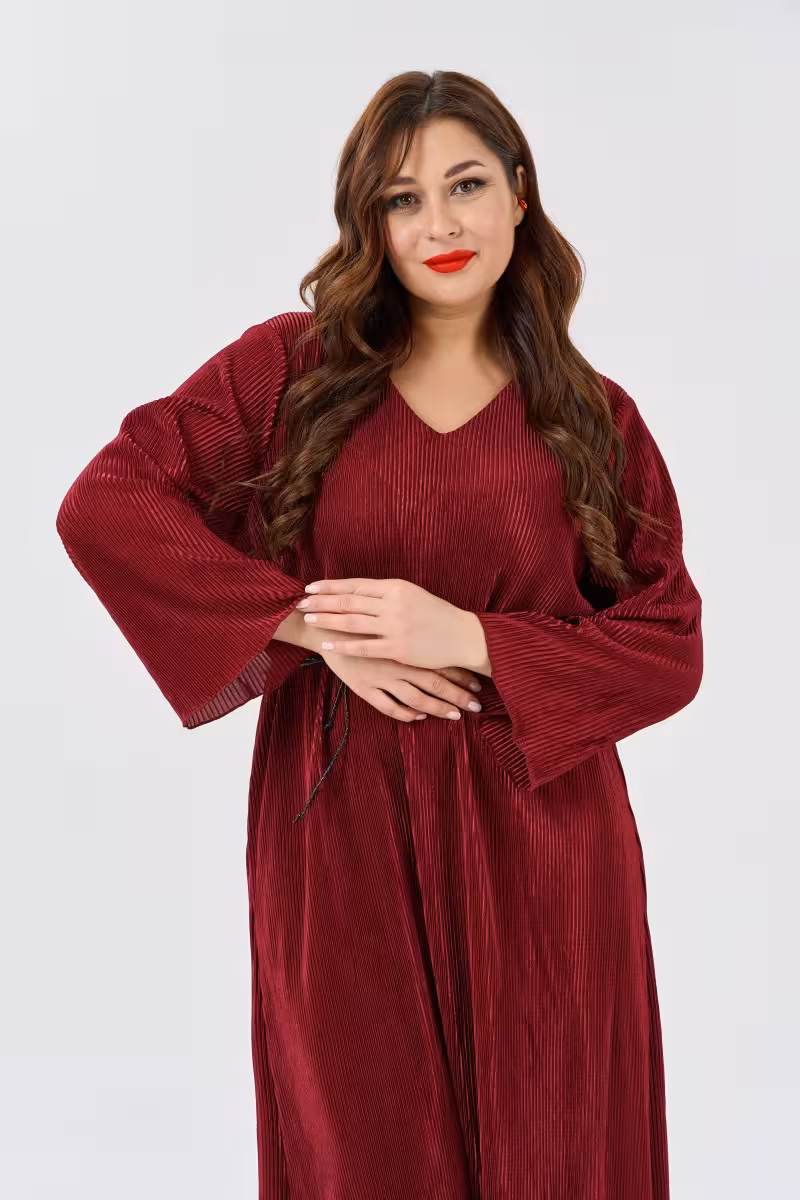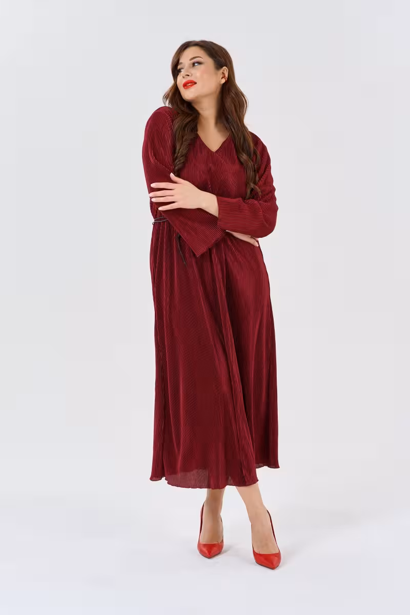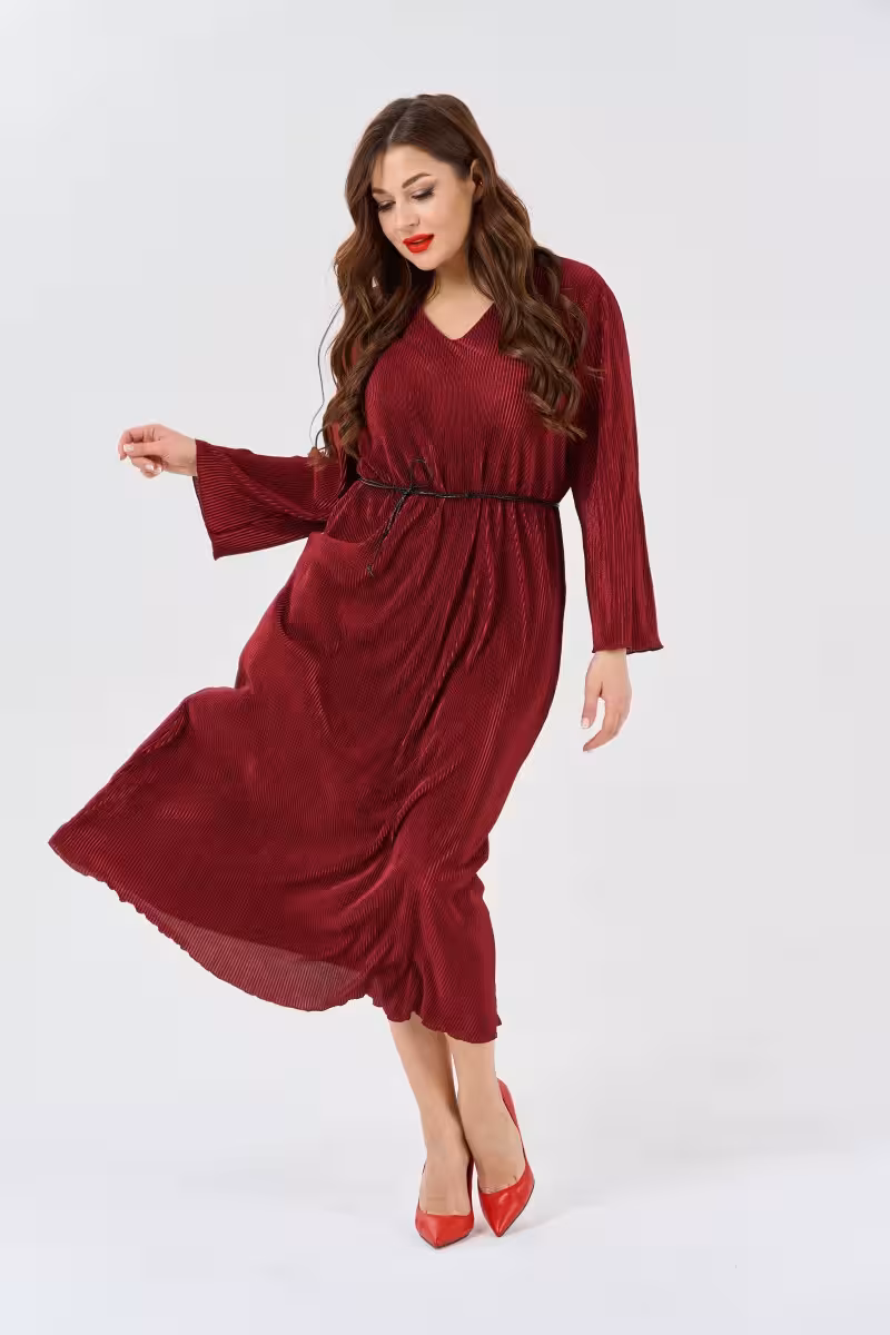 Это платье в насыщенном бордовом цвете станет основой для создания запоминающихся образов. Свободный крой не сковывает движения и позволяет чувствовать себя комфортно весь день. Длинные рукава с мягкими манжетами на запястьях добавляют элегантности а V-образный вырез создает красивую линию декольте.Макси-длина визуально вытягивает силуэт и придает образу торжественность. Платье прекрасно подходит для праздничных мероприятий романтических ужинов или важных встреч. Тонкий плетеный пояс из кожи подчеркивает талию и добавляет акцент в образ.Ткань хорошо держит форму и не просвечивает что обеспечивает комфорт при носке. Модель представлена в двух размерных группах что позволяет выбрать идеальную посадку. Сочетается с элегантными туфлями на каблуке для вечернего выхода или с ботильонами для повседневного образа.Глубокий бордовый оттенок универсален и подходит для любого времени года. Платье легко комбинируется с аксессуарами и верхней одеждой.
