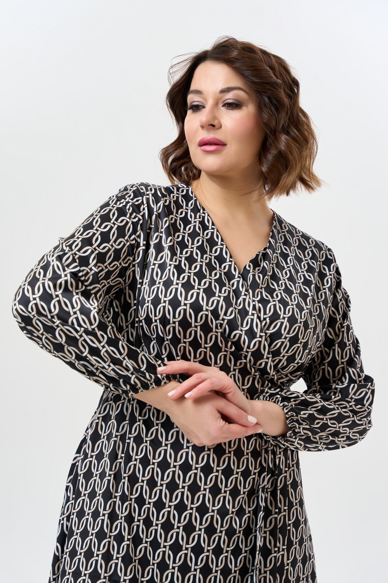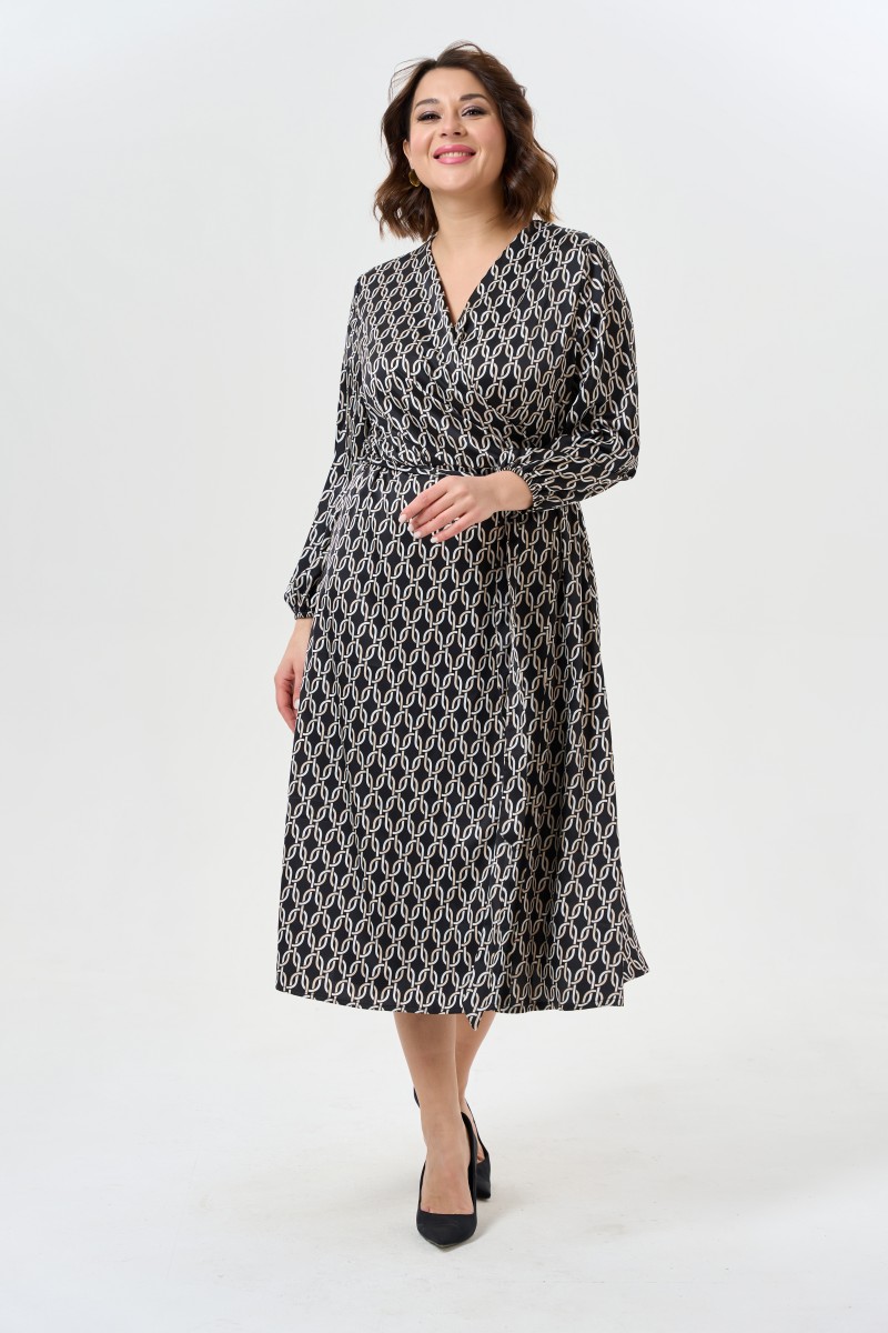 Платье женское приталенного силуэта “”на запах”” с притачным завязывающимся поясом чуть выше линии талии. Нижняя часть платья (юбка) расклешена. V- образная горловина. Рукава втачные длинные по низу собраны на резинку. Размеры сдвоенные 46-4850-5254-56