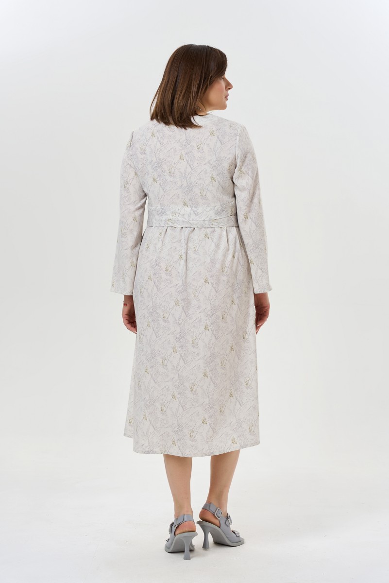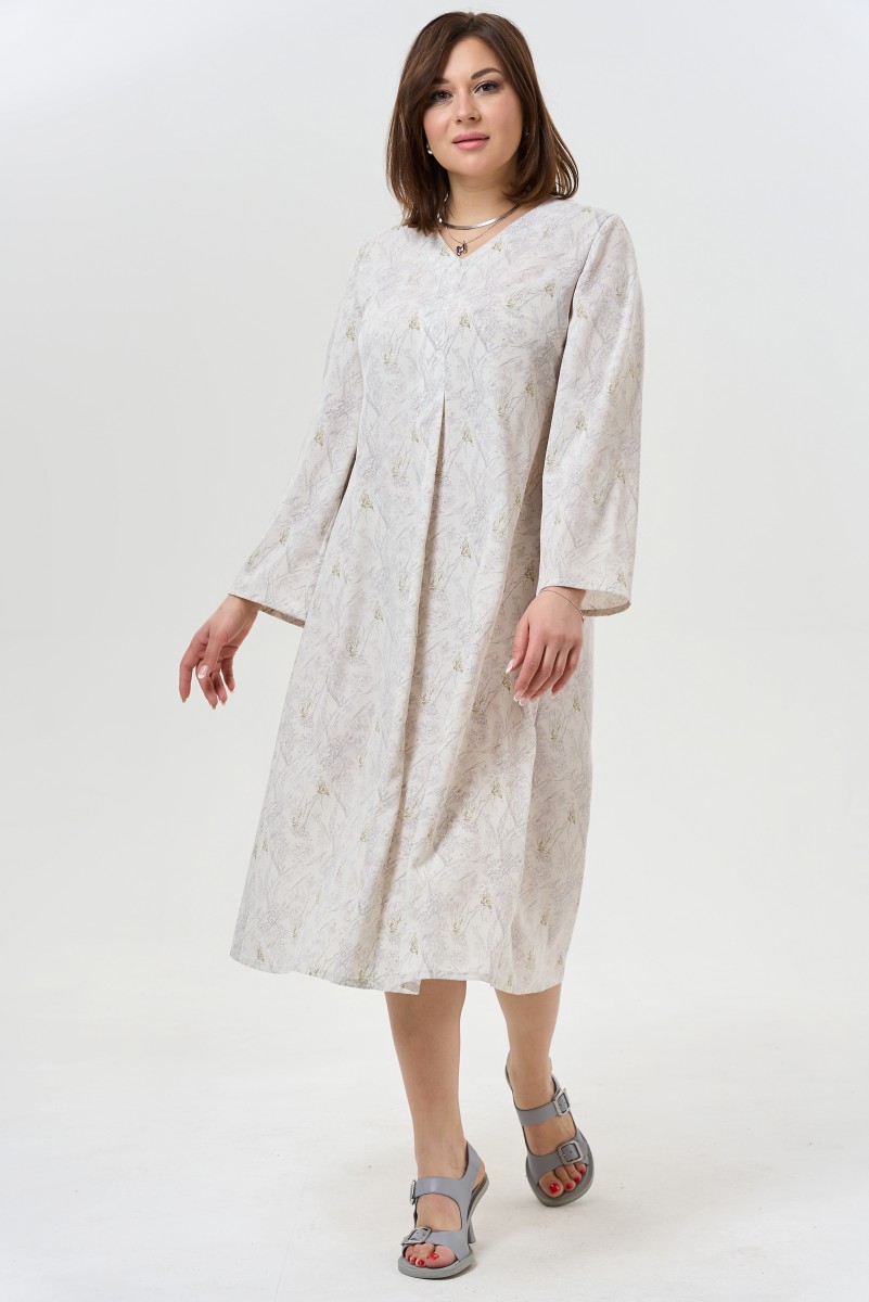 Платье женское свободного силуэта с поясом. По переду застроченная до линии талии складка по центру. По спинке кокетка с отлетным краем. Горловина V-образная. Рукава втачные длинные прямые.