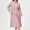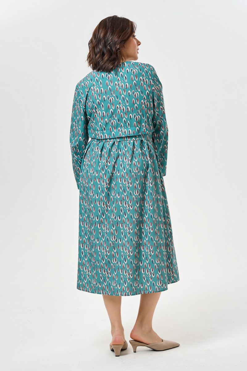 Платье женское свободного силуэта с поясом. По переду застроченная до линии талии складка по центру. По спинке кокетка с отлетным краем. Горловина V-образная. Рукава втачные длинные прямые.
