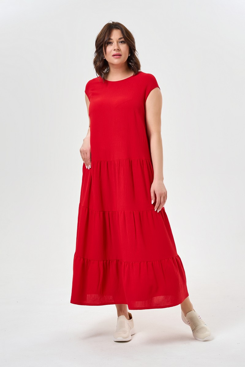 Платье женское свободного силуэта c тремя ярусами на сборке.Горловина круглая . Рукав кимано. Горловина и пройма обработаны окантовкой.