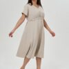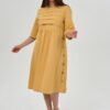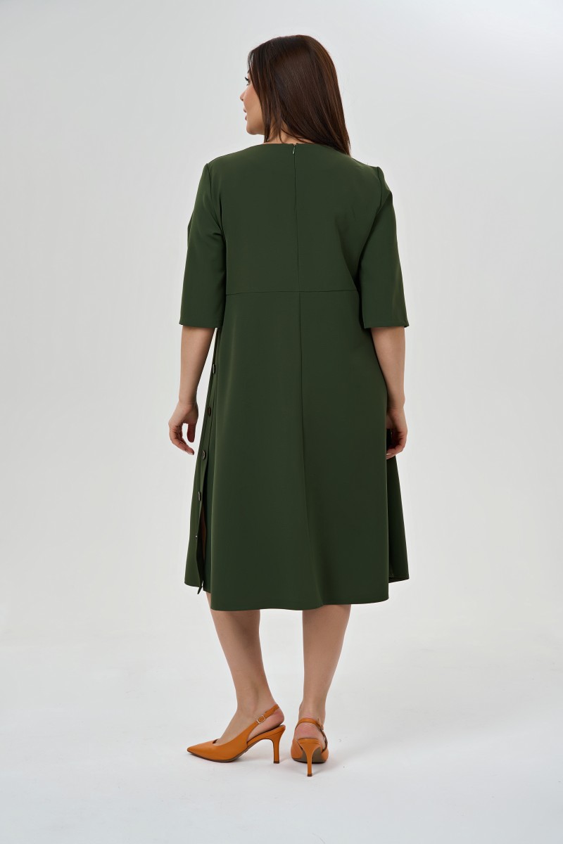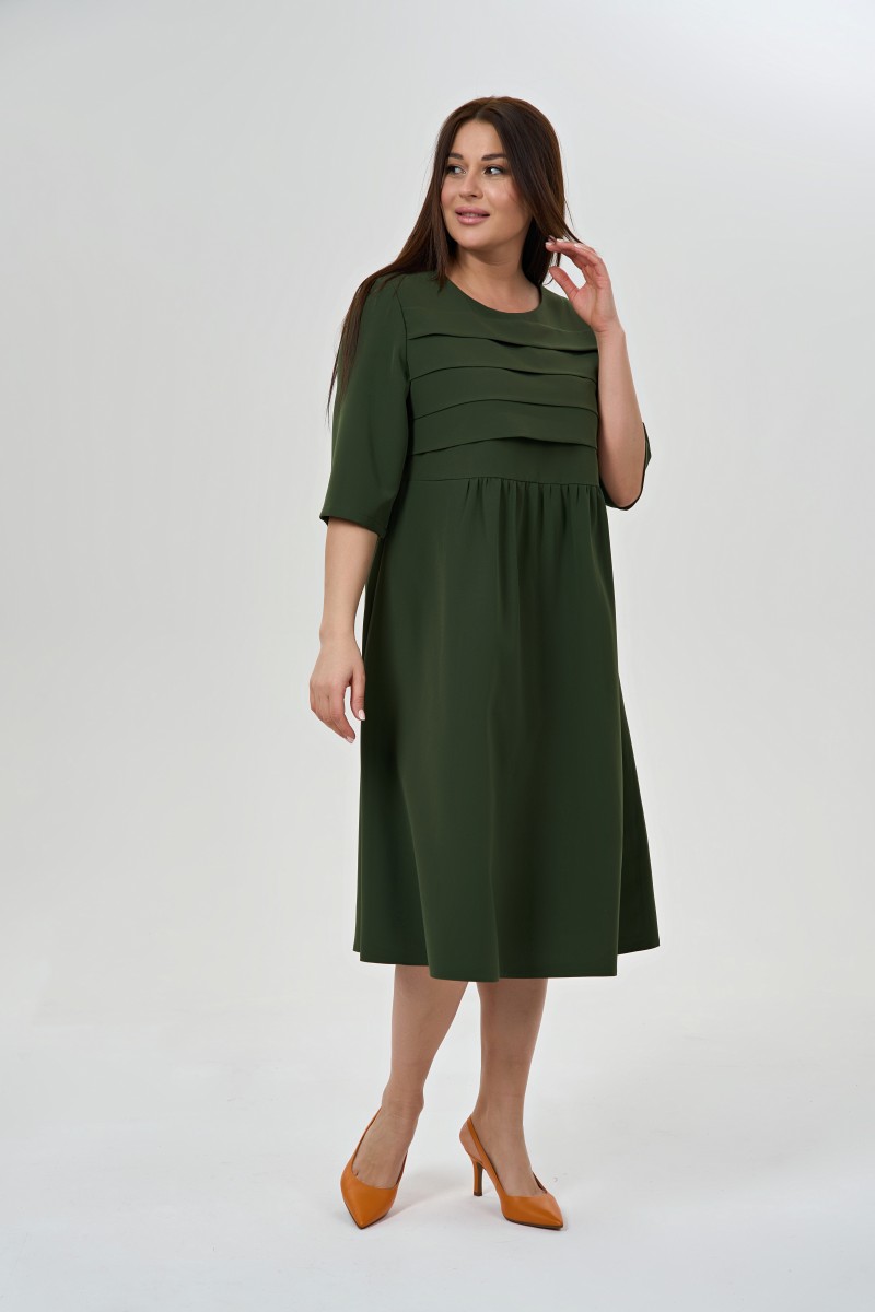 Платье женское силуэт трапеция.Верхняя часть переда отрезная и заложена складками .горловина круглая с застежкой по спинке.Рукав втачноой.Полевому боку нижней части переда притапная планка ререходящая в разрез .На планке шесть пуговиц.