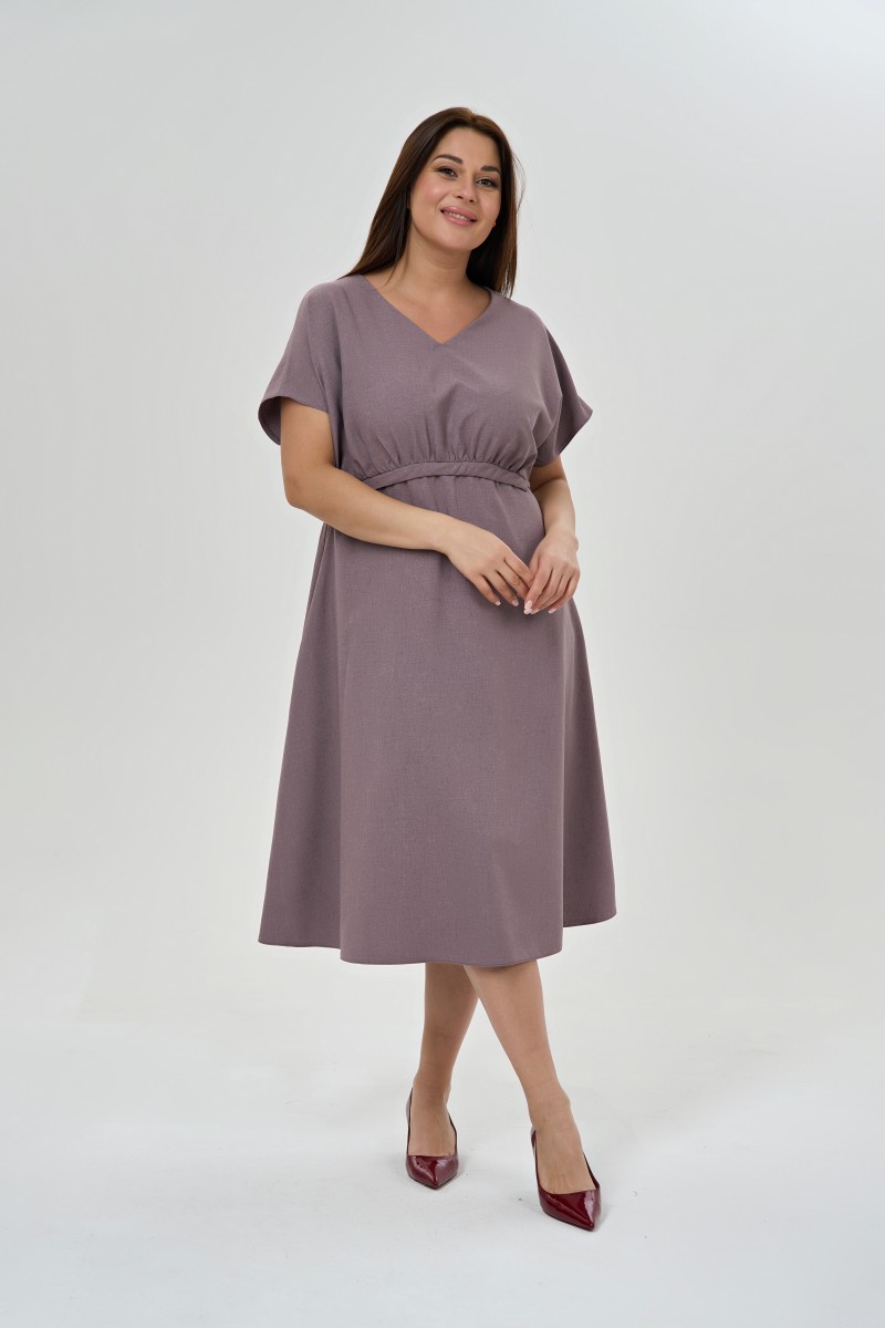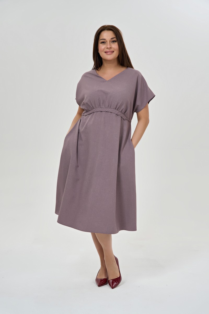 Платье с подрезом по переду под грудьюрасширено к низу.Рукав кимонокороткий.В подрез вставлена кулискав которую продергивается пояс.
