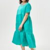 Летнее платье свободного силуэта с ярусами бирюзового цвета. Верх выполнен из трикотажа в цвет основной ткани. Ярусы выполнены из хлопковой ткани. Платье с коротким прямым рукавом.