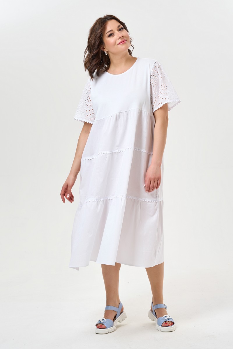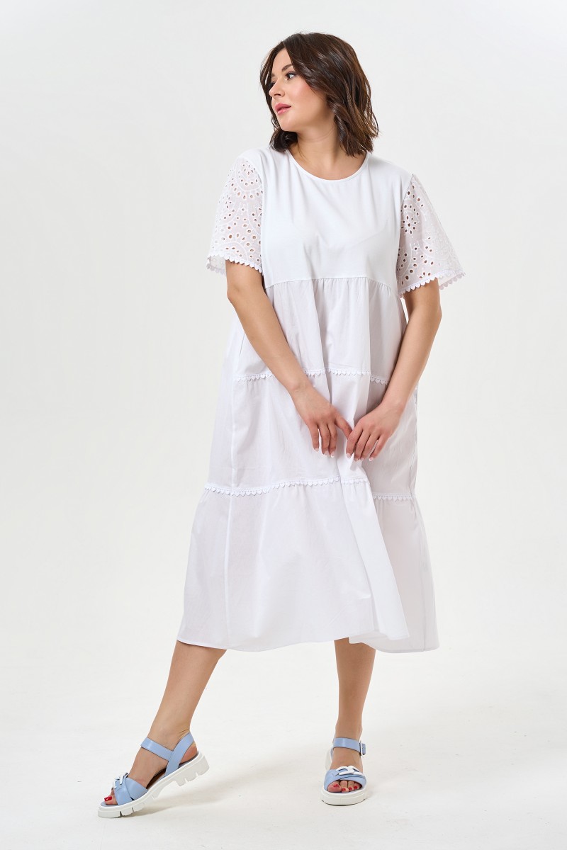 Летнее платье с ярусами. Верх выполнен из трикотажа в цвет основной ткани. Ярусы выполнены из хлопковой ткани. Платье с коротким прямым рукавом.