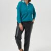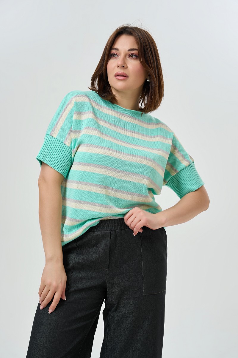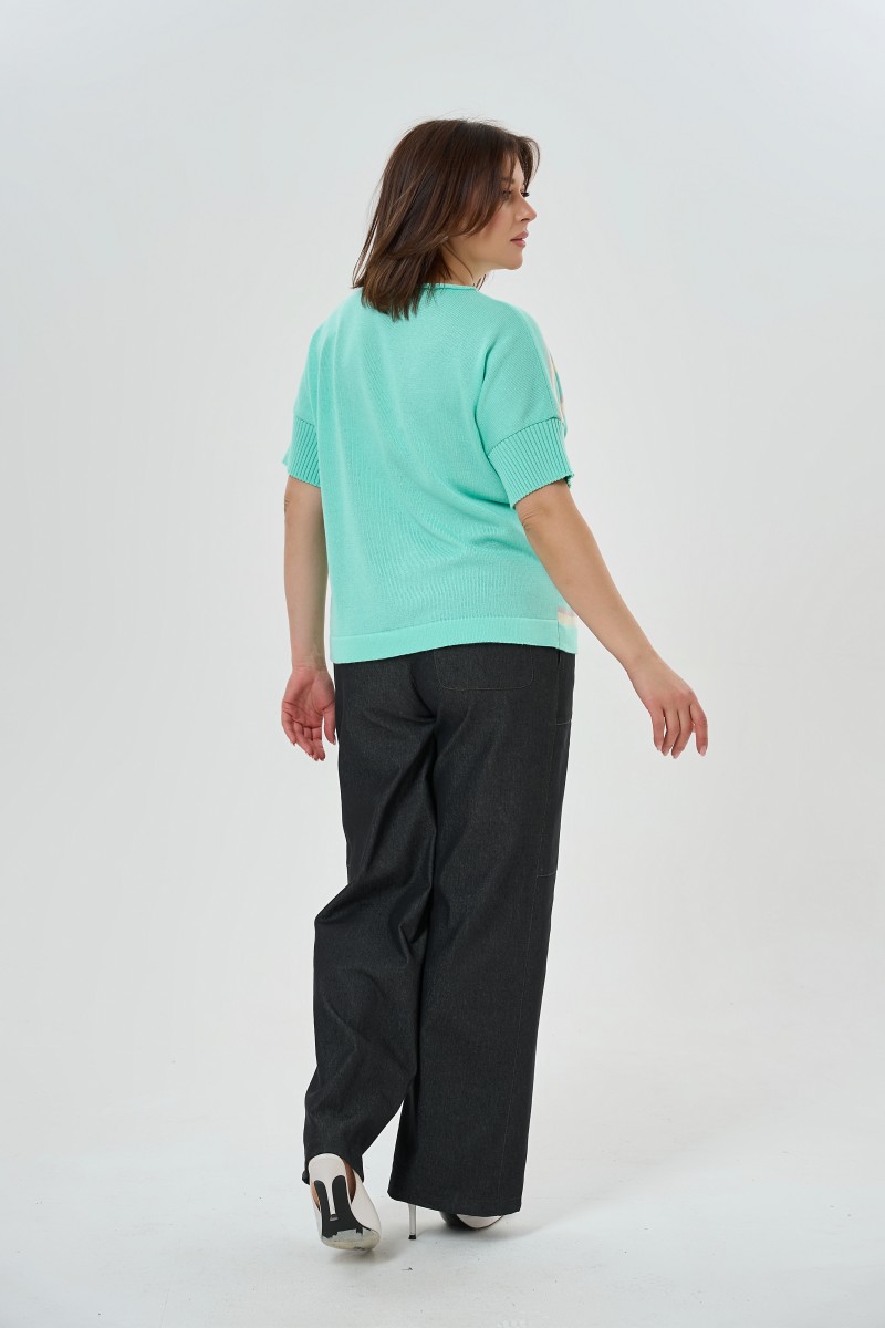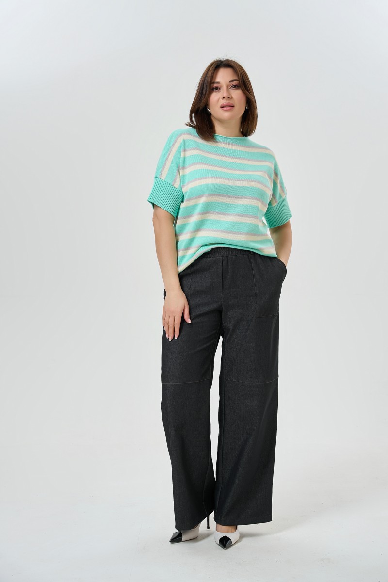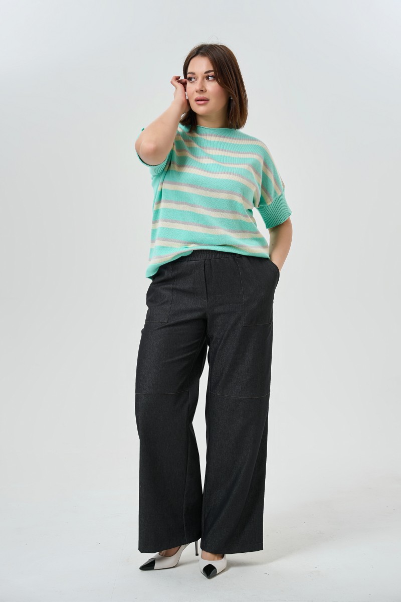 Брюки джинсовые широкие прямые с накладными карманами. Горизонтальный подрез выше линии колена с контрасной отстрочкой делает модель интересной. Пояс притачной на резинке без застежки.