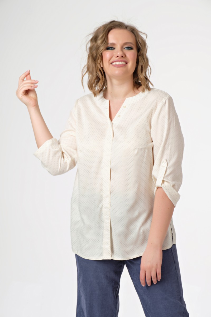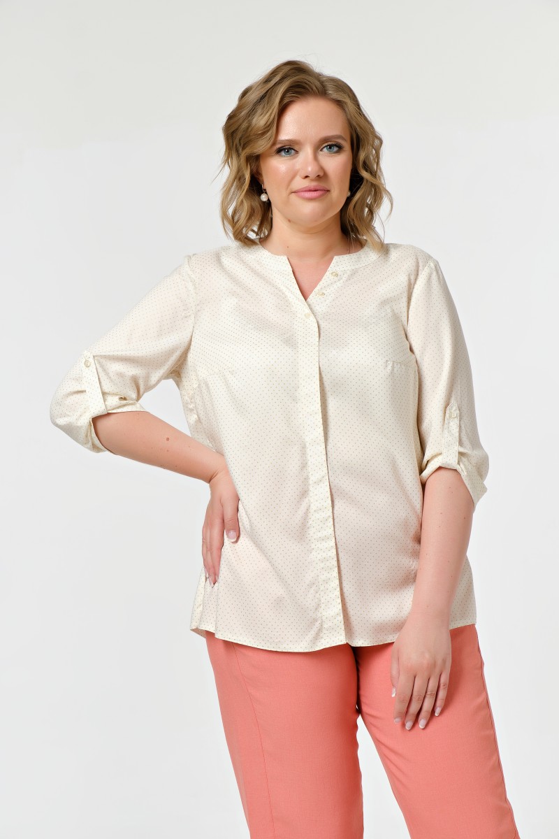 Блузка женская прямого силуэта классического стиля. Рукава втачные длиной ¾. Длина рукавов регулируется патами с застежкой на пуговицу. На переде нагрудные вытачки имитация супатной застежки и 3 отделочные пуговицы на верхней части планки. Спинка с ко