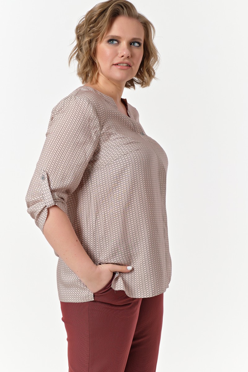 Блузка женская прямого силуэта классического стиля. Рукава втачные длиной ¾. Длина рукавов регулируется патами с застежкой на пуговицу. На переде нагрудные вытачки имитация супатной застежки и 3 отделочные пуговицы на верхней части планки. Спинка с ко