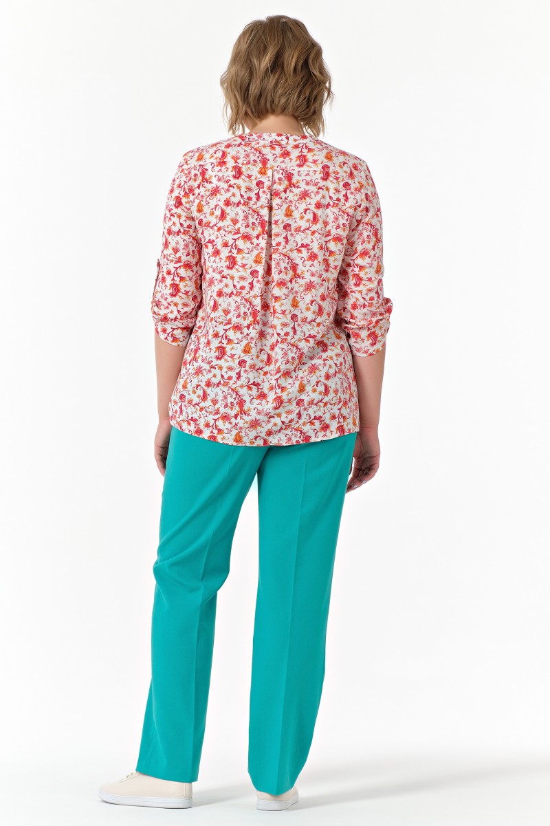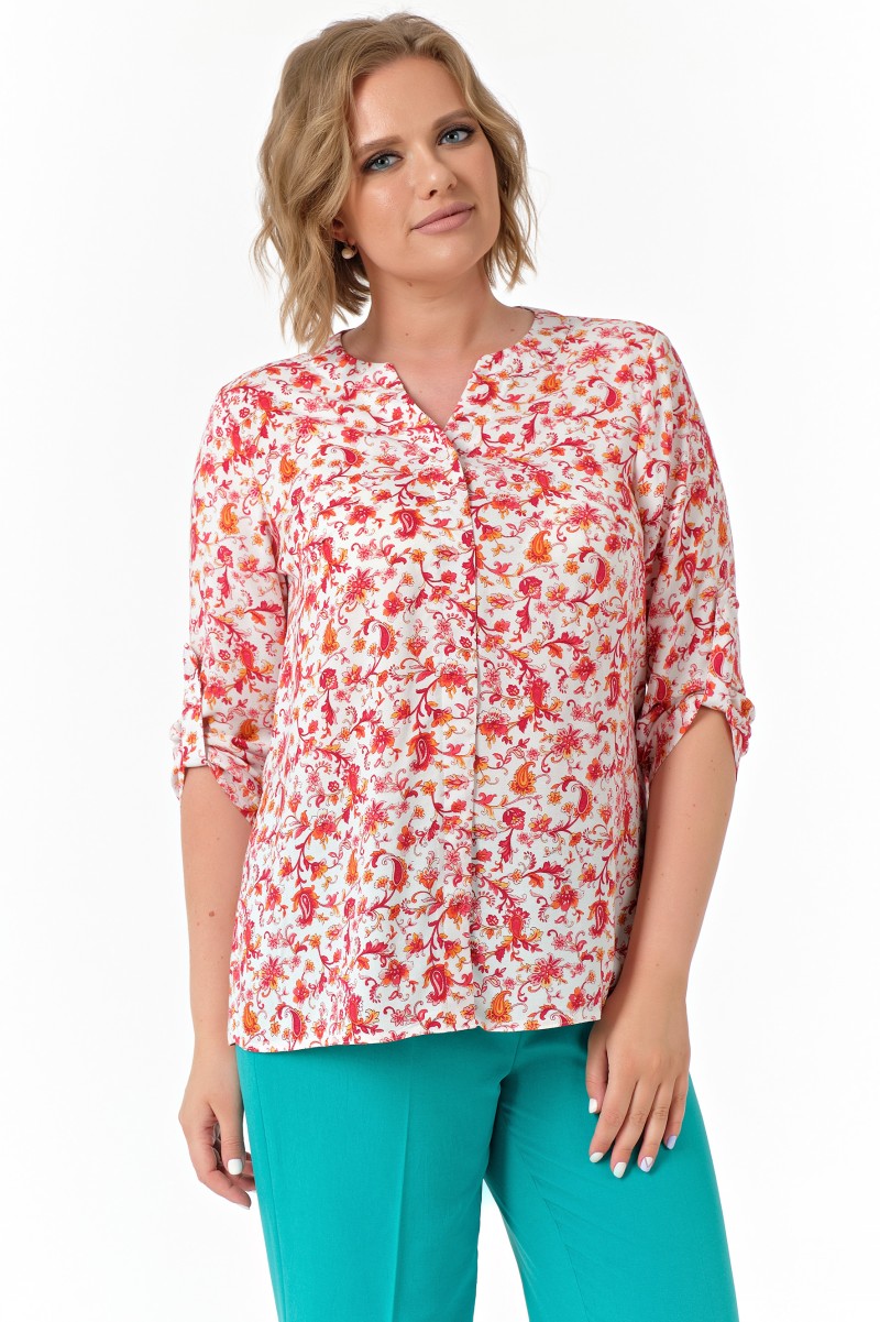 Блузка женская прямого силуэта классического стиля. Рукава втачные длиной ¾. Длина рукавов регулируется патами с застежкой на пуговицу. На переде нагрудные вытачки имитация супатной застежки и 3 отделочные пуговицы на верхней части планки. Спинка с ко