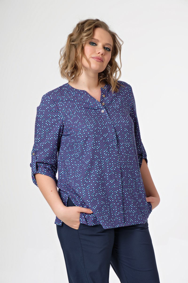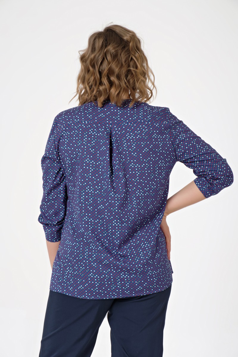 Блузка женская прямого силуэта классического стиля. Рукава втачные длиной ¾. Длина рукавов регулируется патами с застежкой на пуговицу. На переде нагрудные вытачки имитация супатной застежки и 3 отделочные пуговицы на верхней части планки. Спинка с ко
