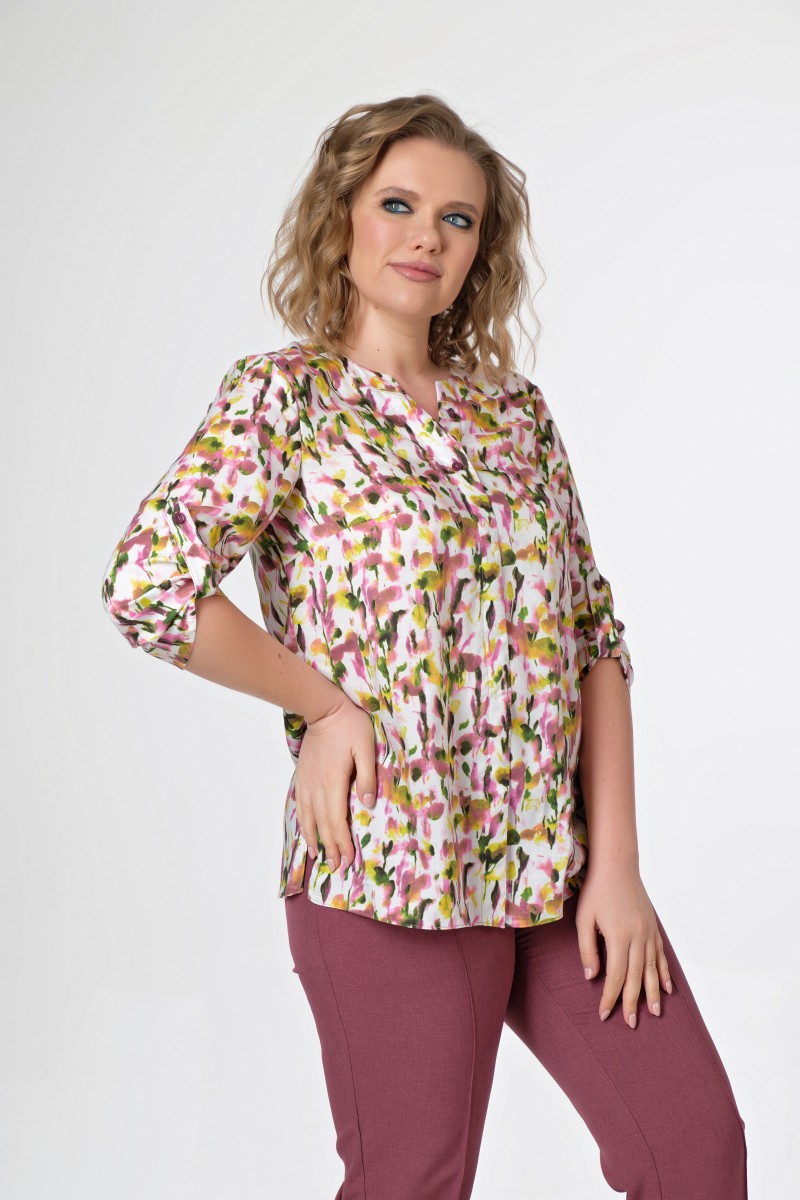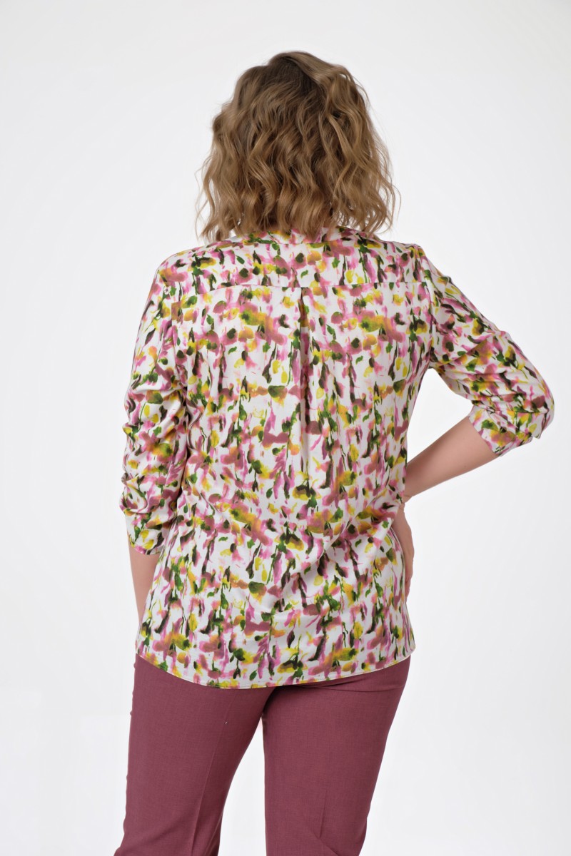 Блузка женская прямого силуэта классического стиля. Рукава втачные длиной ¾. Длина рукавов регулируется патами с застежкой на пуговицу. На переде нагрудные вытачки имитация супатной застежки и 3 отделочные пуговицы на верхней части планки. Спинка с ко