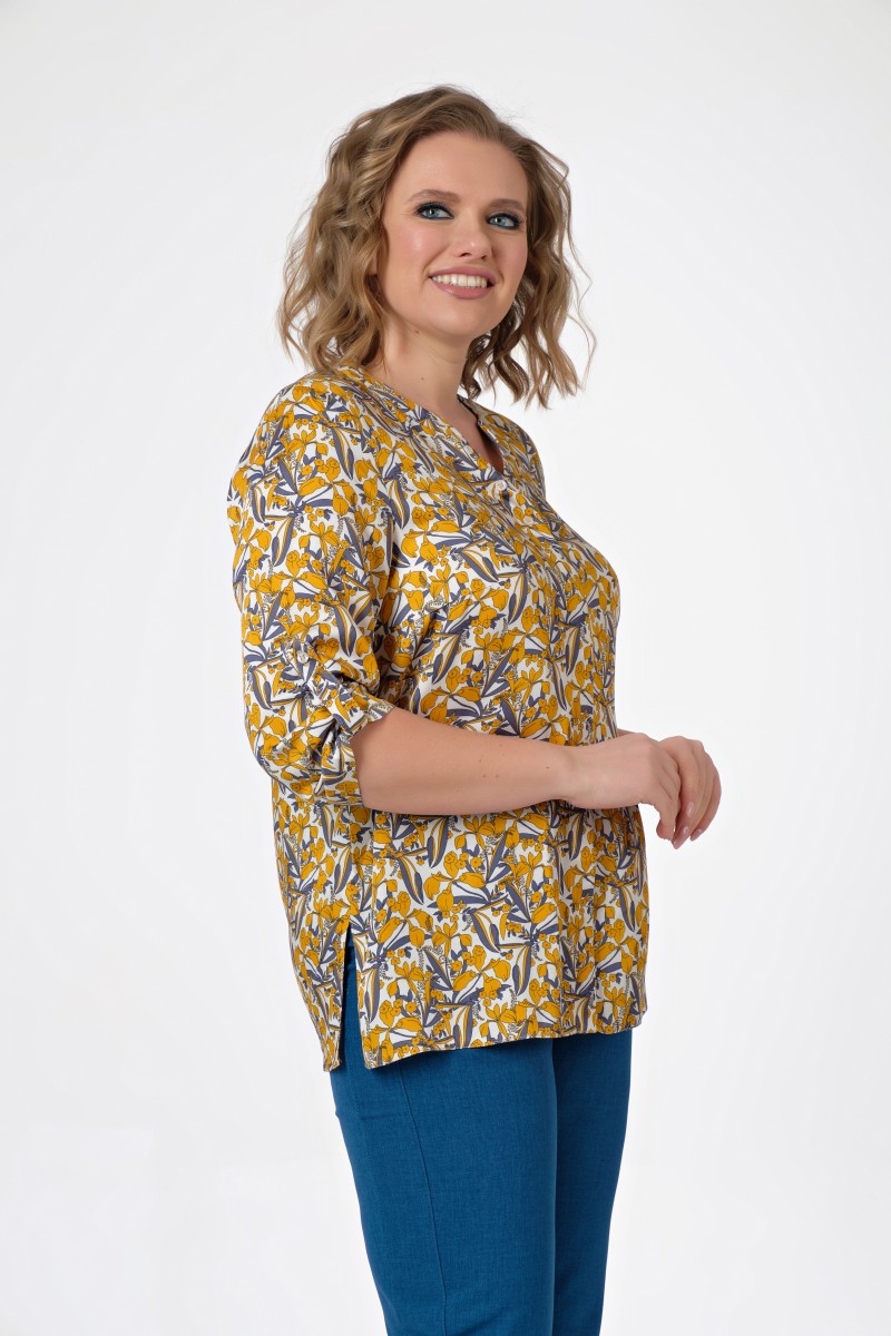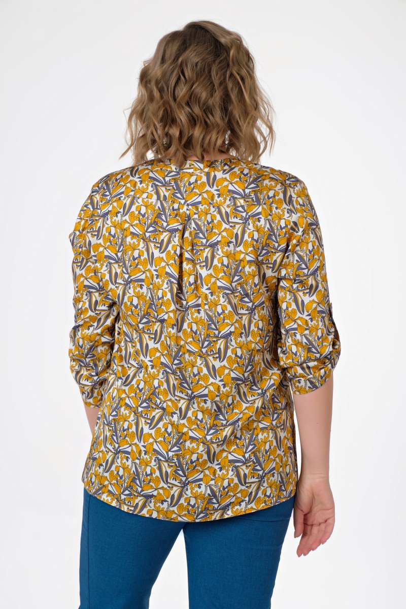 Блузка женская прямого силуэта классического стиля. Рукава втачные длиной ¾. Длина рукавов регулируется патами с застежкой на пуговицу. На переде нагрудные вытачки имитация супатной застежки и 3 отделочные пуговицы на верхней части планки. Спинка с ко