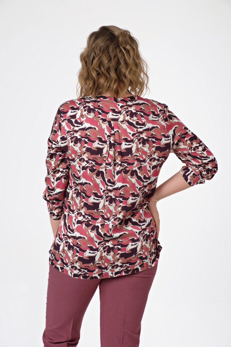 Блузка женская прямого силуэта классического стиля. Рукава втачные длиной ¾. Длина рукавов регулируется патами с застежкой на пуговицу. На переде нагрудные вытачки имитация супатной застежки и 3 отделочные пуговицы на верхней части планки. Спинка с ко