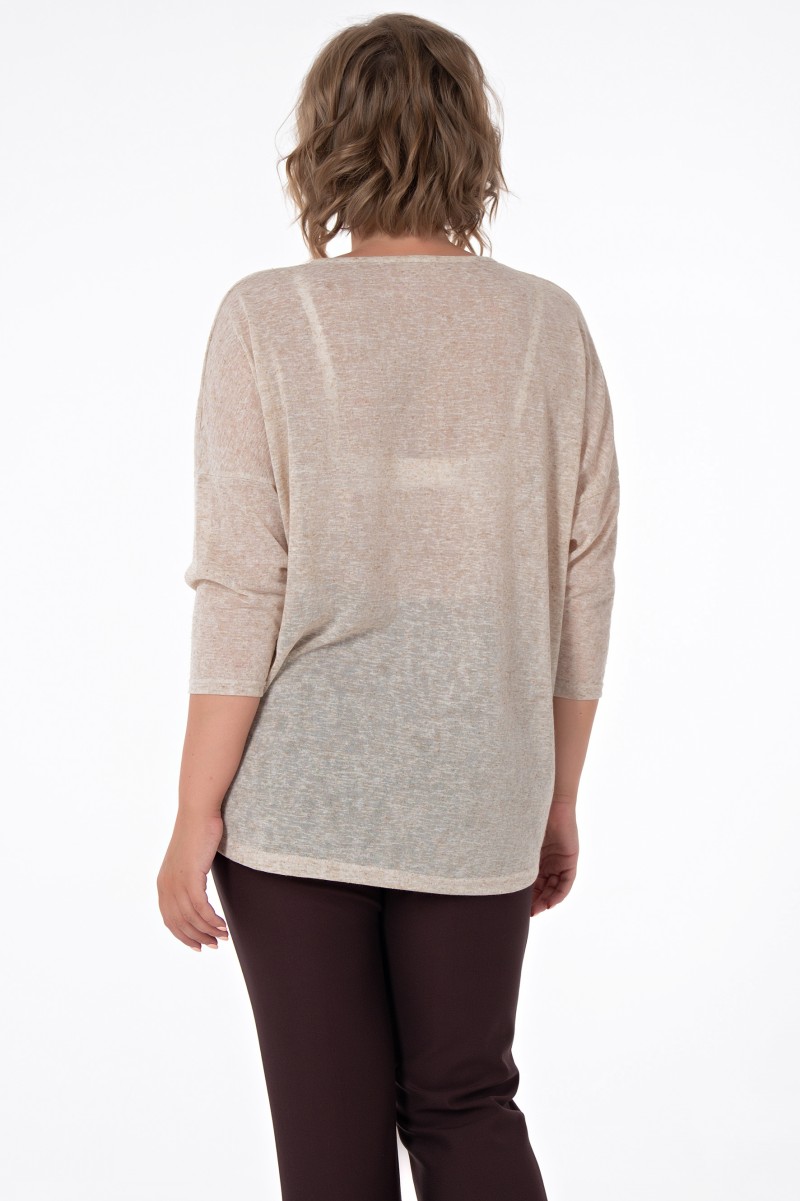 Блузка женская прямого силуэта из трикотажного полотна. Рукава длиной 7/8 цельнокроеные с членением выше локтя. Горловина блузки круглая окантованная. Низ блузки — на переде оформлен кружевом на спинке — удлиненный овальной формы. Стиль повседневный.