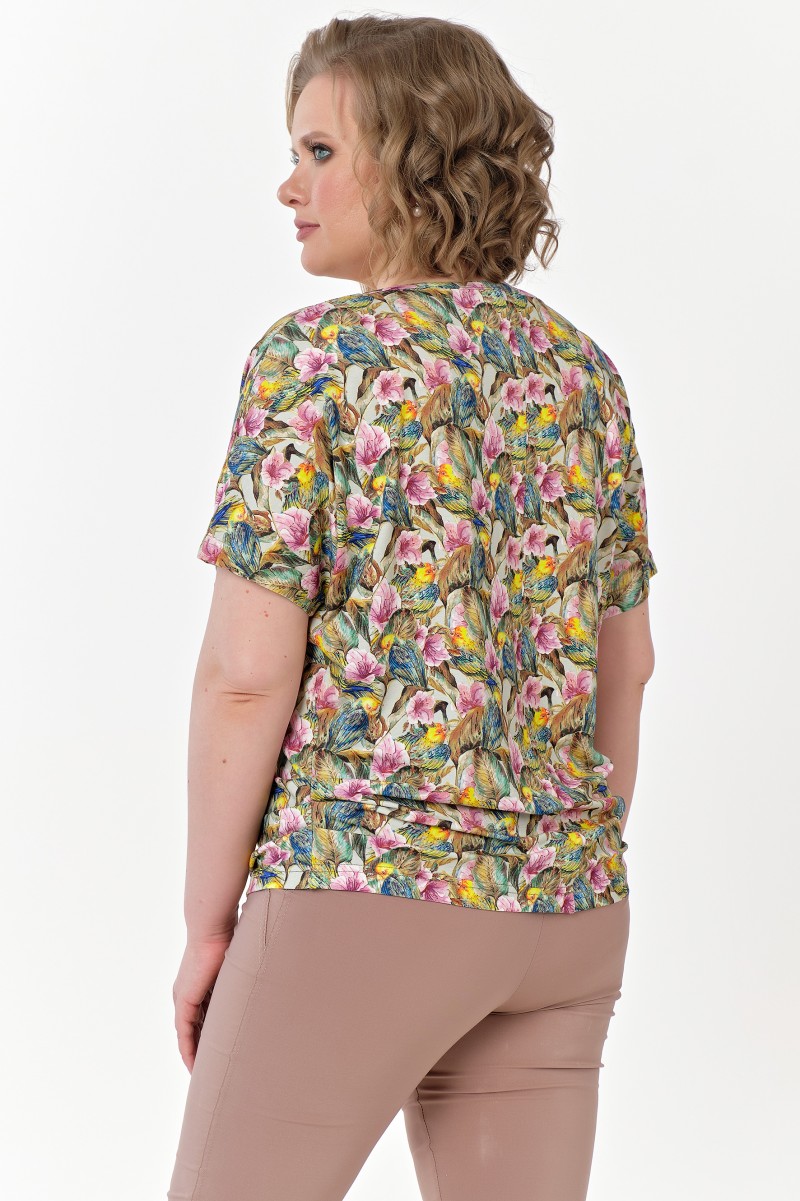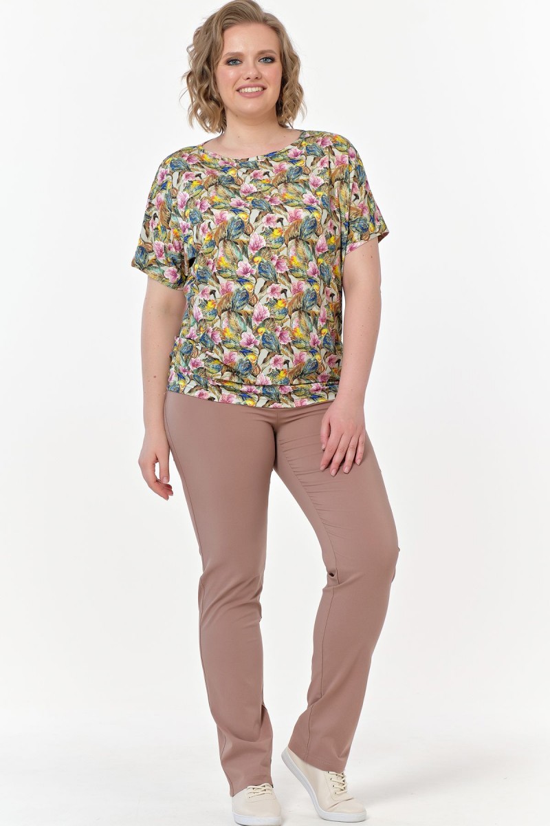 Блузка женская прямого силуэта из трикотажного полотна с короткими цельнокроеными рукавами.Горловина круглая окантованная. По боковым швам в нижней части переда и спинки заложены складки. Стиль повседневный.
