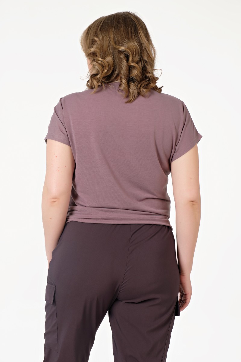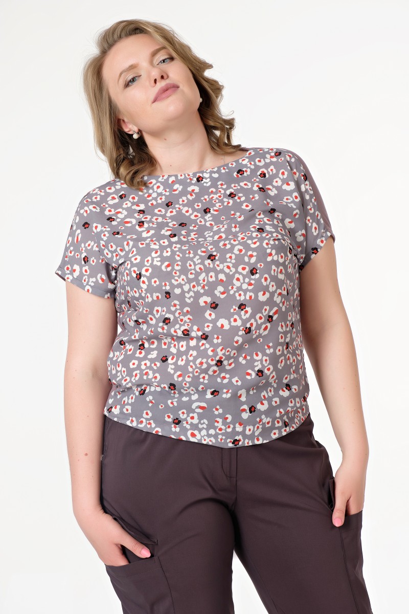 Блузка женская прямого силуэта комбинированная из трикотажного полотна и ткани. Рукава цельнокроенные короткие. Горловина джемпера круглая окантованная по спинке по переду обработана обтачкой. Блузки с 60 по 66 размер с вертикальными рельефами. Стиль п