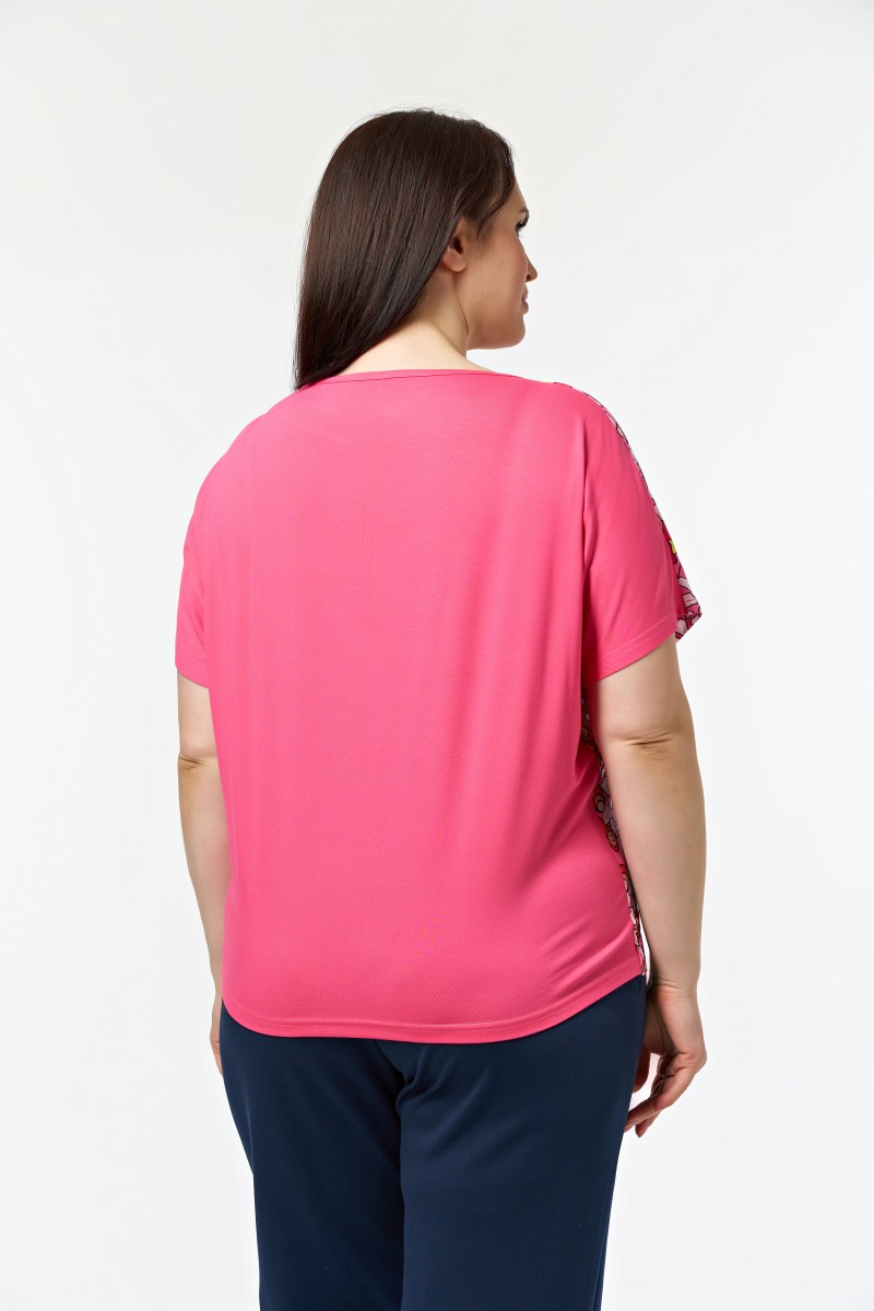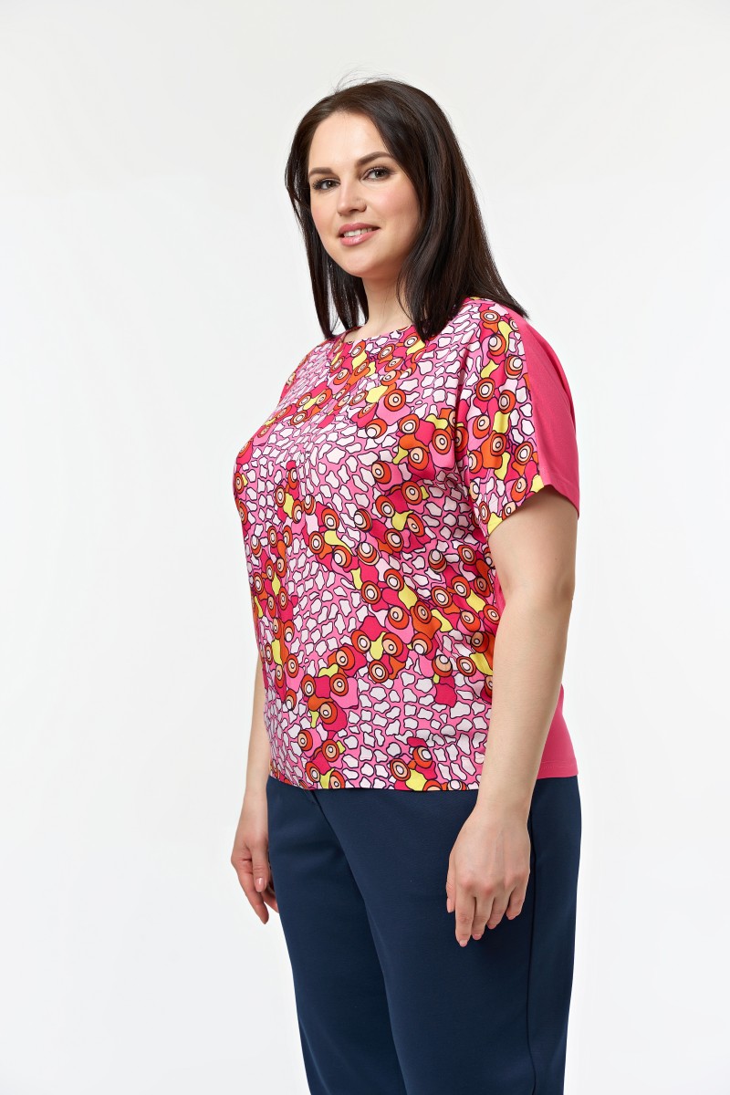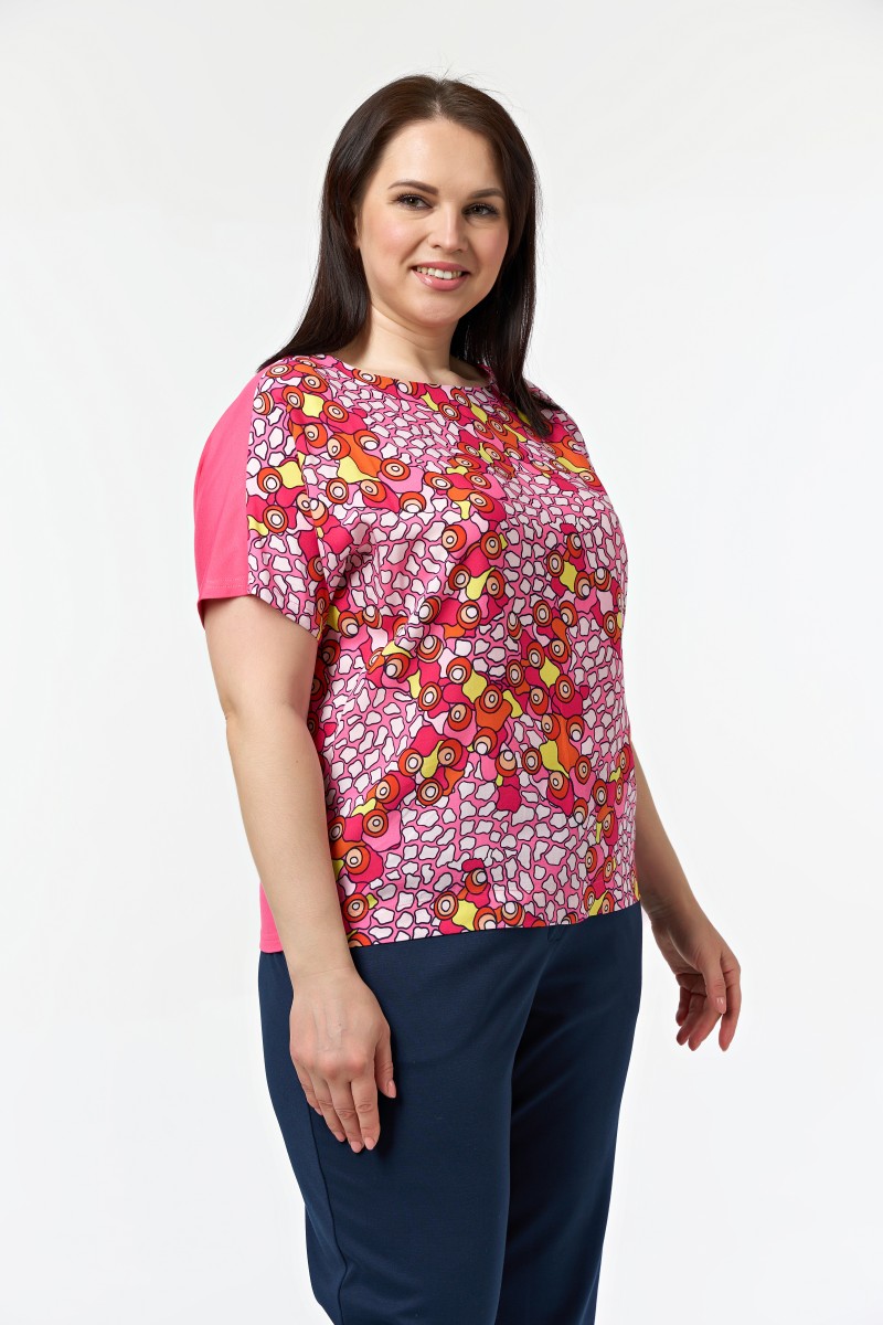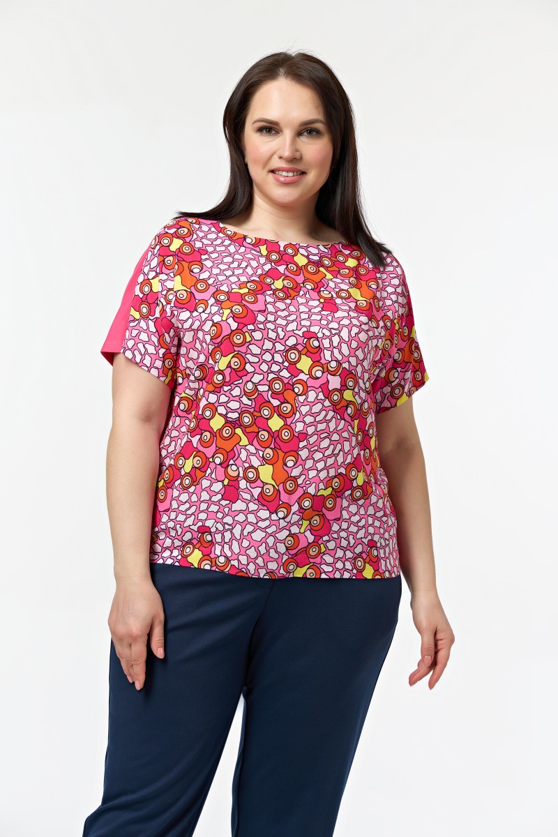 Блузка женская прямого силуэта комбинированная из трикотажного полотна и ткани. Рукава цельнокроенные короткие. Горловина джемпера круглая окантованная по спинке по переду обработана обтачкой. Блузки с 60 по 66 размер с вертикальными рельефами. Стиль п