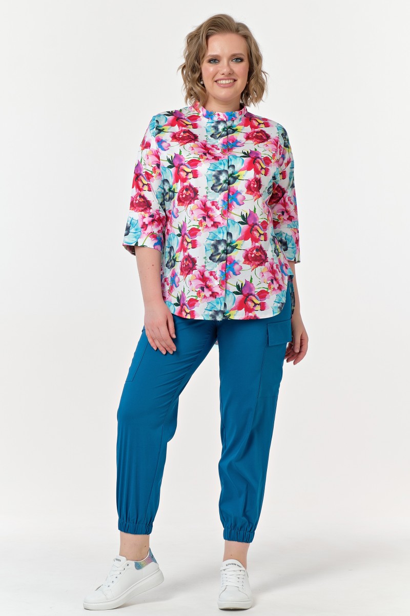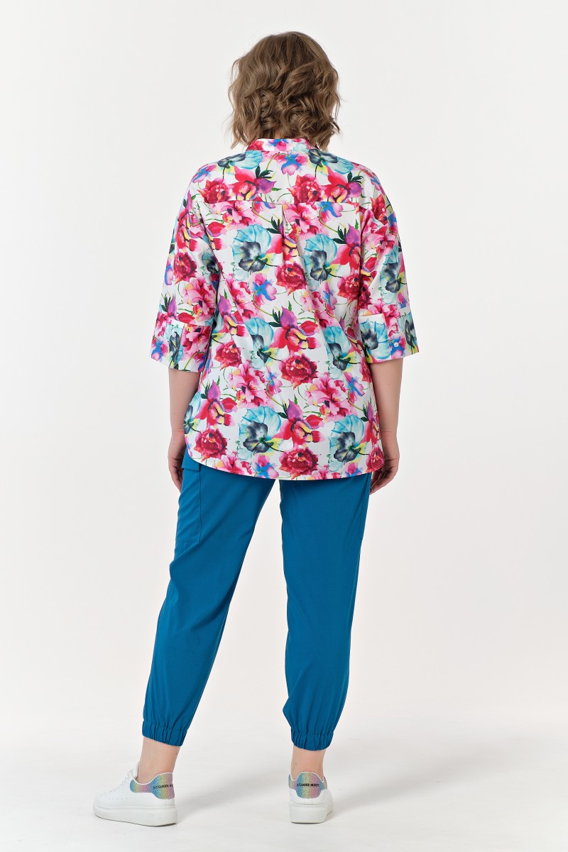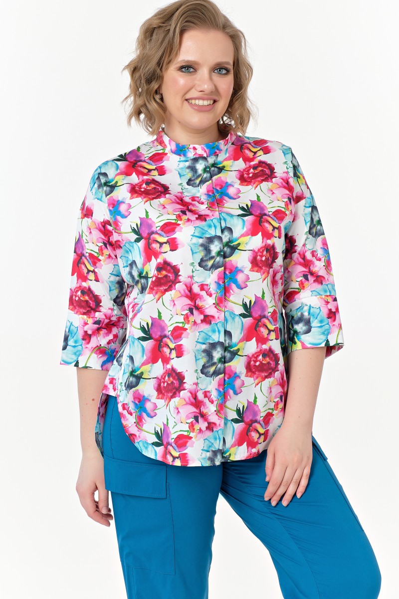 Рубашка женская прямого силуэта. Перед с супатной застежкой по центру на 6 пуговиц. Спинка на кокетке по середине заложена встречная складка. Боковые швы с треугольными вставками скошены к линии низа. Низ спинки удлинен относительно переда. Рукава длиной