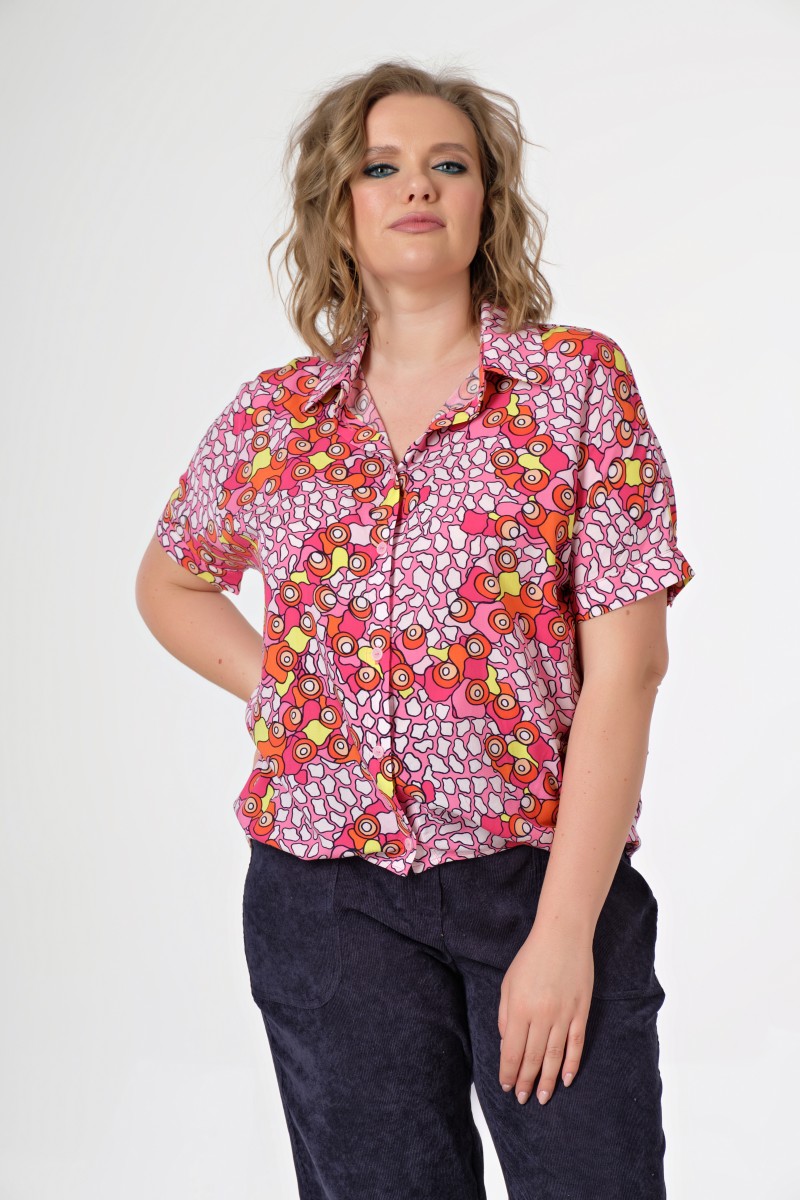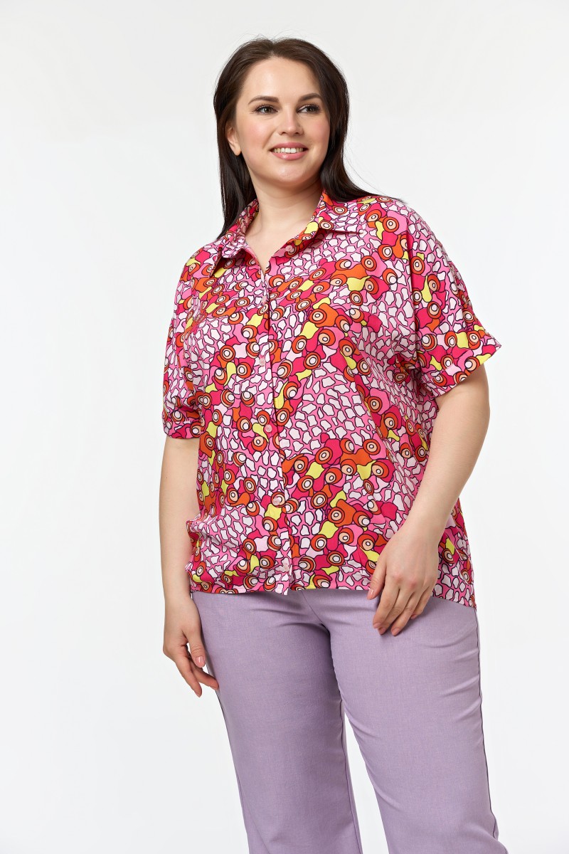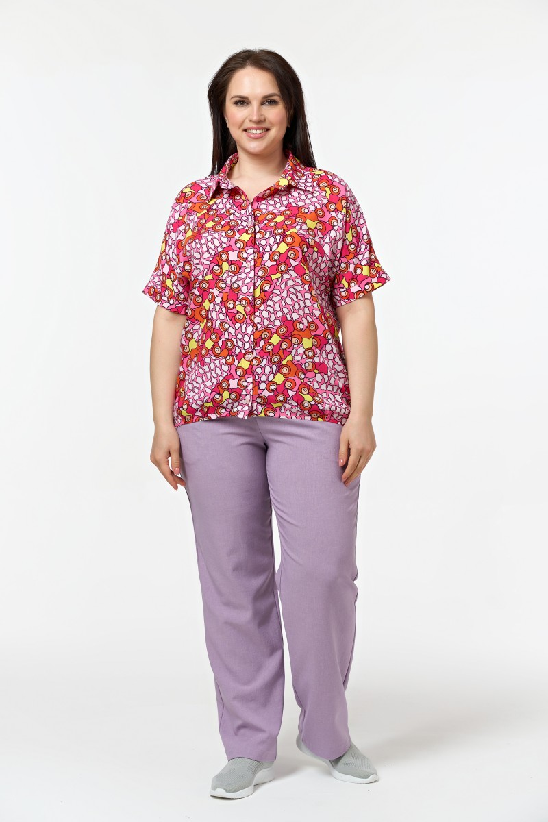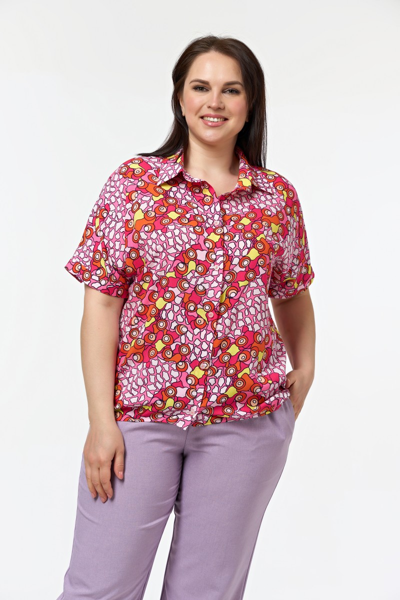 Блузка прямого силуэта/ с цельнокроеным рукавом выше локтя. Воротник отложной на притачной стойке. Перед – с центральной застежкой до верха на 7 обметанных петель и 7 пуговиц. Спинка цельная до размера 58 начиная с 60 размера на детали спинки есть средний